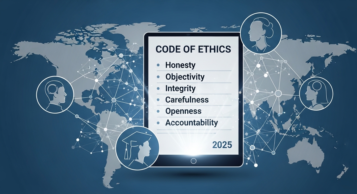 연구윤리 강령과 전 세계 연구자들이 서로 연결된 모습을 상징하는 추상적인 이미지.