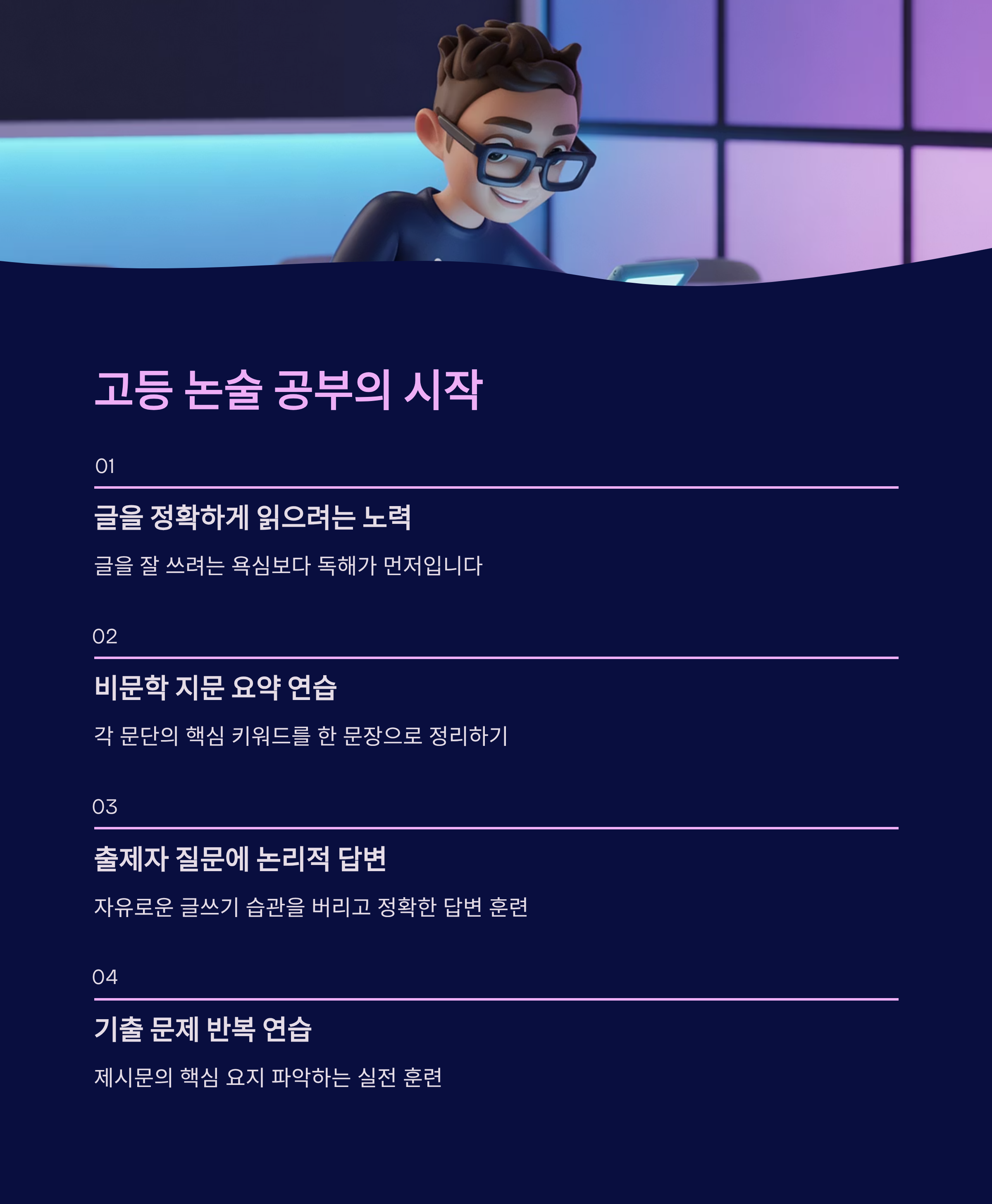 결국 고등학교 논술에서 성공하기 위해서는 '글을 잘 쓰려는 욕심'보다는 '글을 정확하게 읽으려는 노력'이 선행되어야 합니다. 문학뿐만 아니라 비문학 지문을 읽을 때 각 문단의 핵심 키워드를 한 문장으로 요약하는 연습부터 시작해 보세요.