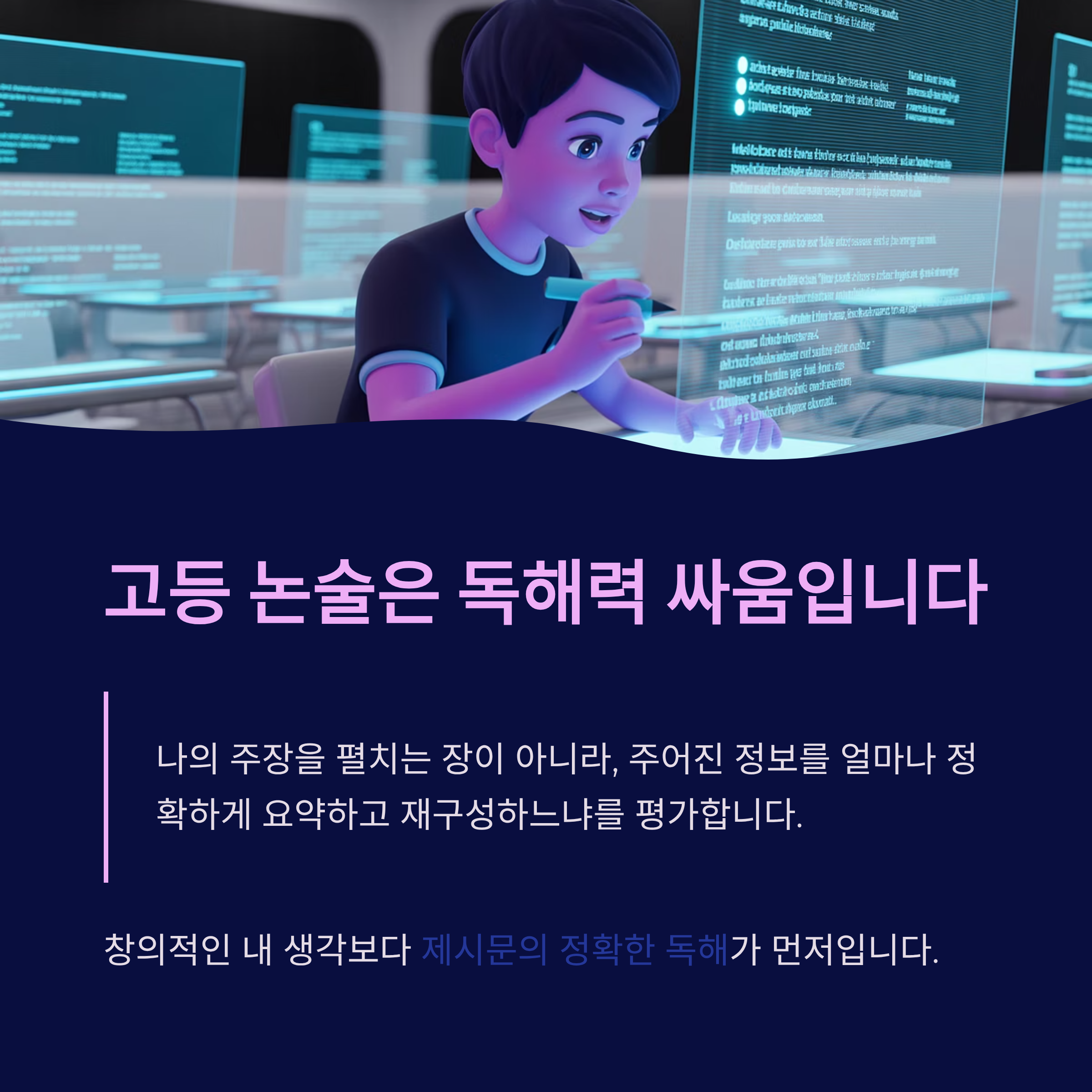 고등 논술은 나의 주장을 펼치는 장이 아니라, 주어진 정보를 얼마나 정확하게 요약하고 재구성하느냐를 평가하는 '독해력 싸움'입니다.