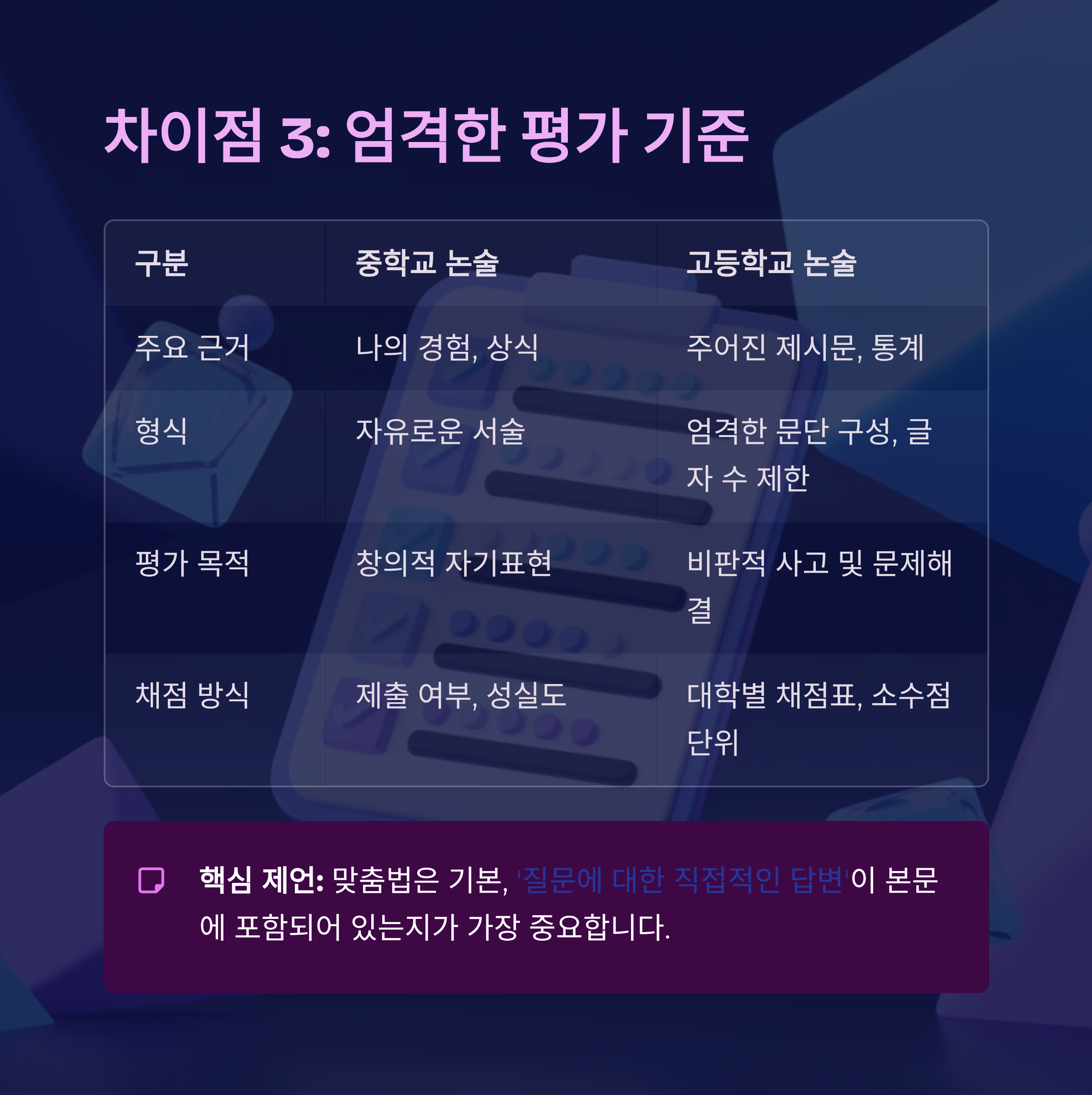 중학교 수행평가 논술은 제출 여부와 기본적인 성실도가 중요했다면, 고등학교 논술(특히 대입 논술)은 대학별 채점 기준표에 따라 소수점 단위까지 점수가 매겨집니다.