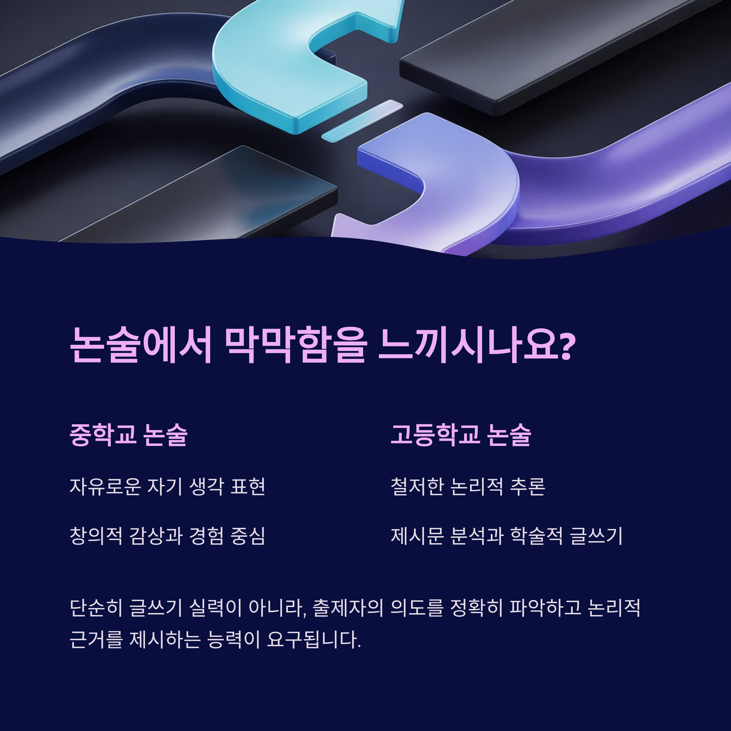 "중학교 때는 글 좀 쓴다는 소리 들었는데, 고등학교 논술은 왜 이렇게 어려울까요?" 중학교 논술이 자유로운 자기 생각을 표현하는 단계라면, 고등학교 논술은 철저한 '논리적 추론'과 '제시문 분석'의 영역입니다. 입시의 당락을 결정짓는 고등 논술의 핵심 변화를 지금 바로 확인해 보세요.