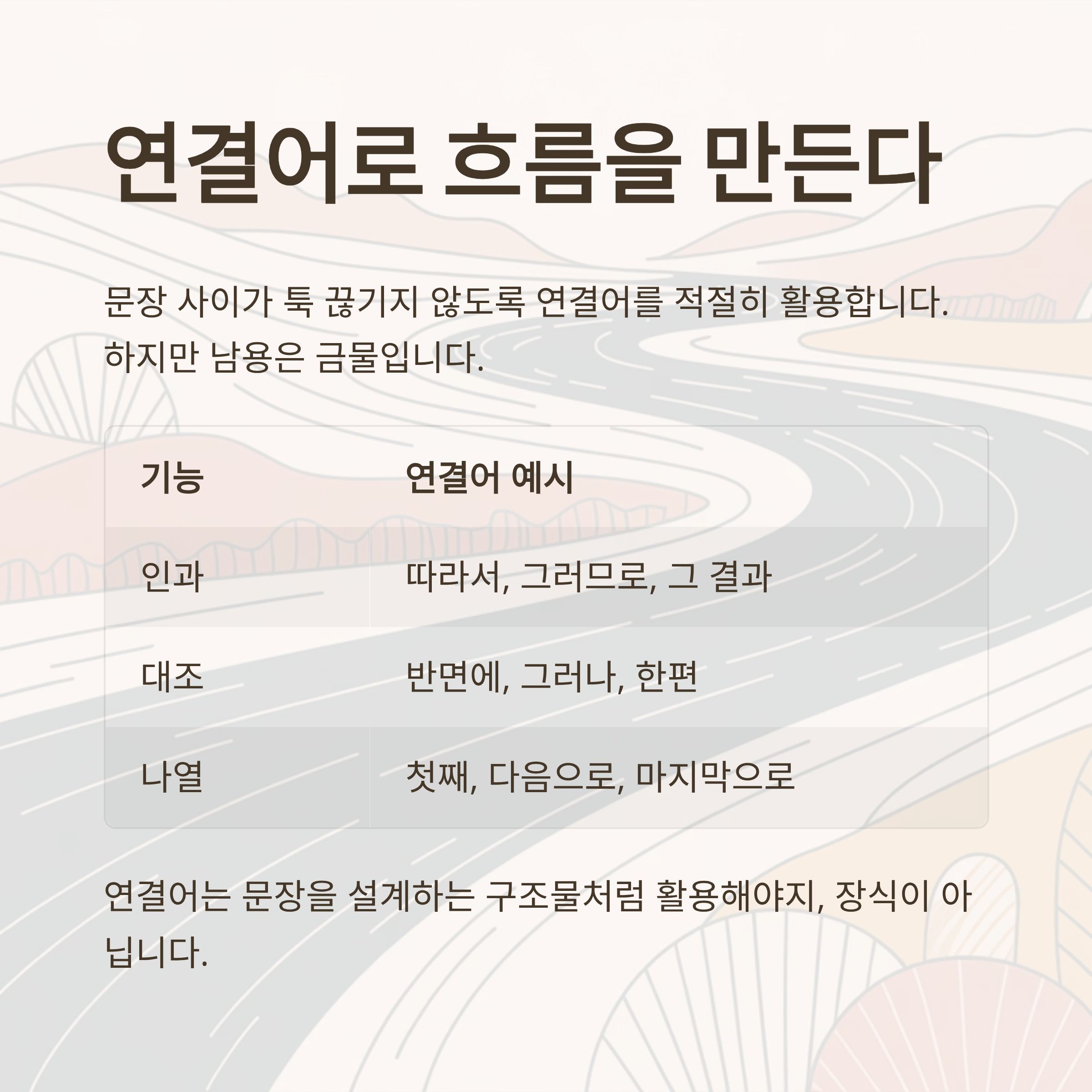 연결어는 문장을 설계하는 구조물처럼 활용해야지, 장식이 아닙니다.