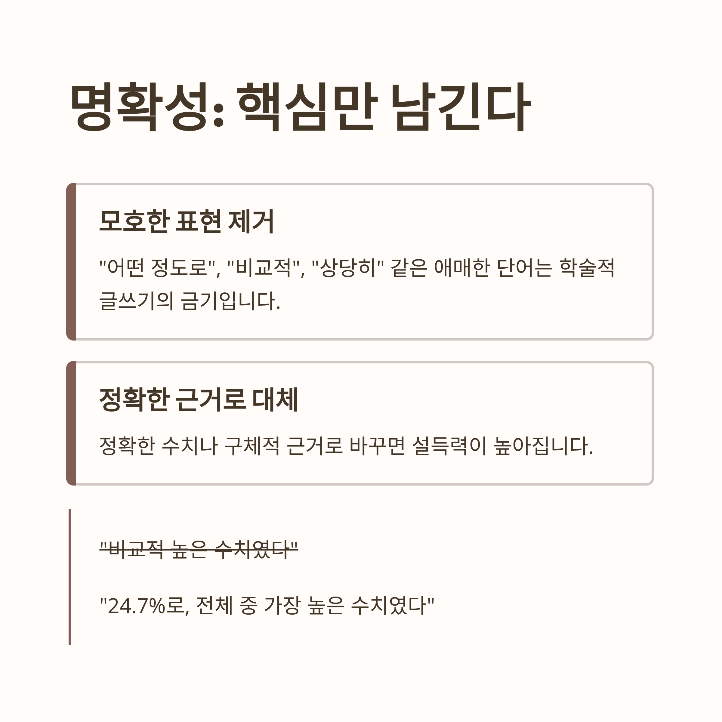 "어떤 정도로", "비교적", "상당히" 같은 모호한 표현은 학술적 글쓰기에서 금기입니다.