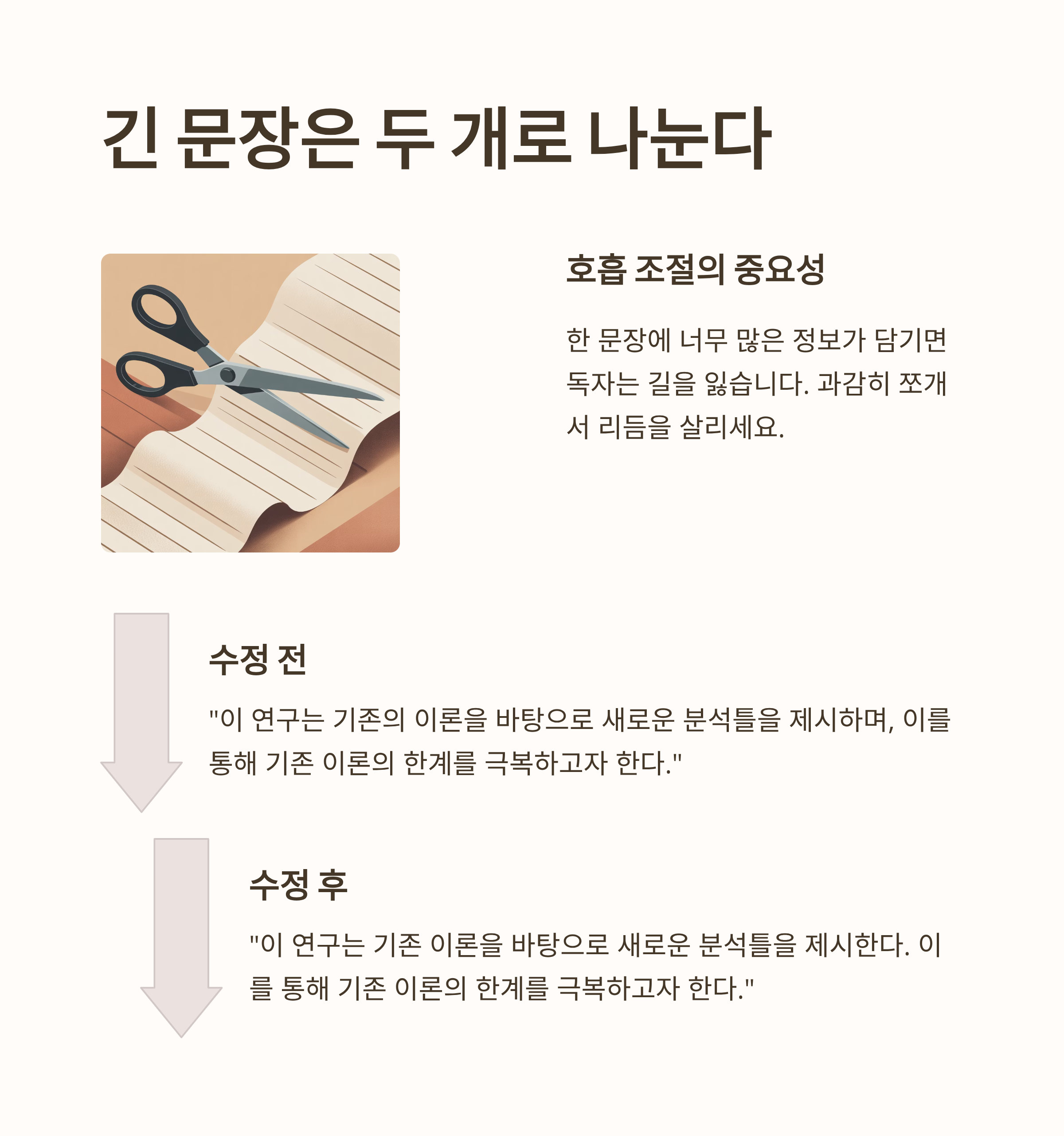 짧은 문장 두 개가 긴 문장 하나보다 더 설득력 있게 다가올 때가 많습니다.