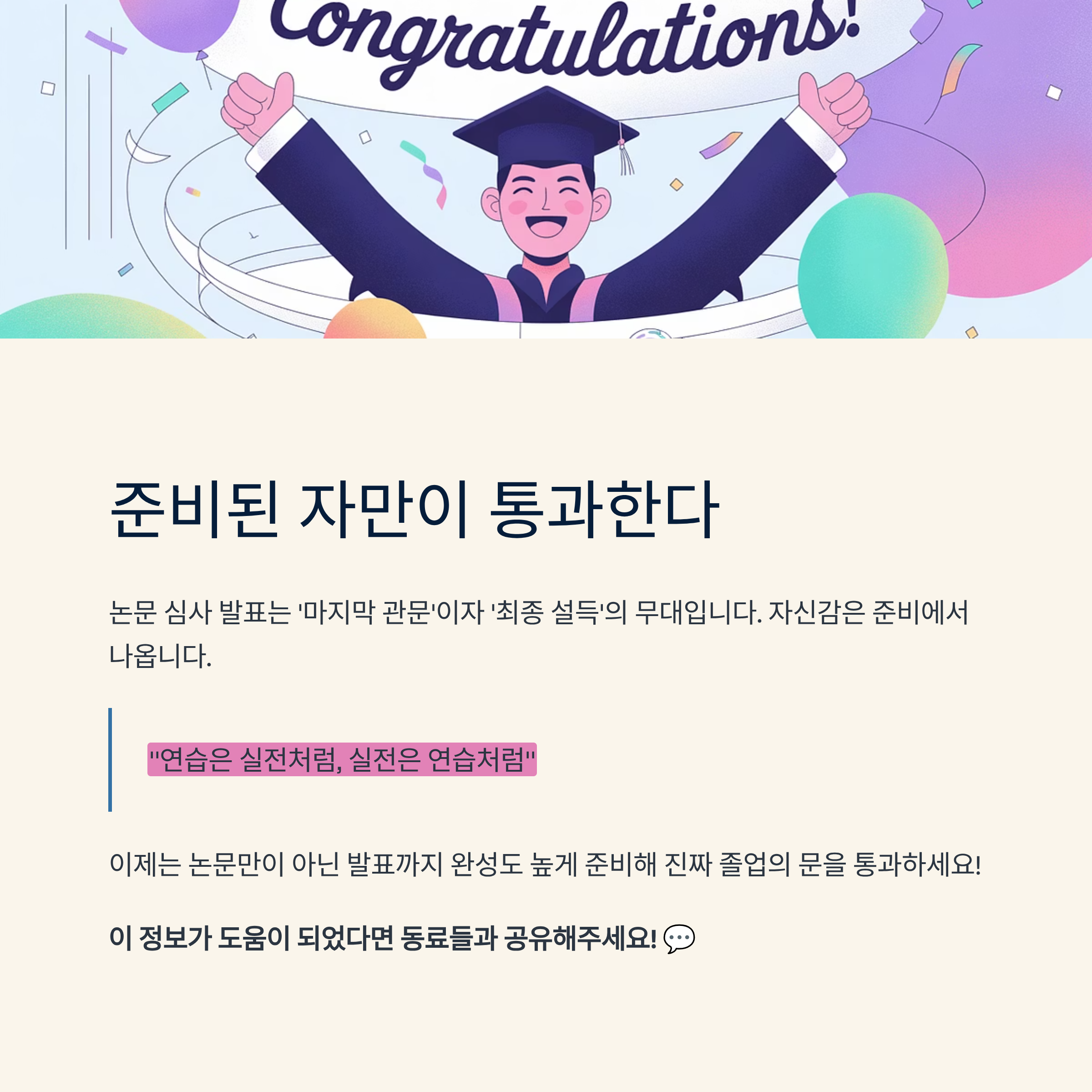 | 💡 알아두세요 논문 심사 발표는 ‘마지막 관문’이자 ‘최종 설득’의 무대입니다. 연습과 전략은 선택이 아닌 필수입니다. |