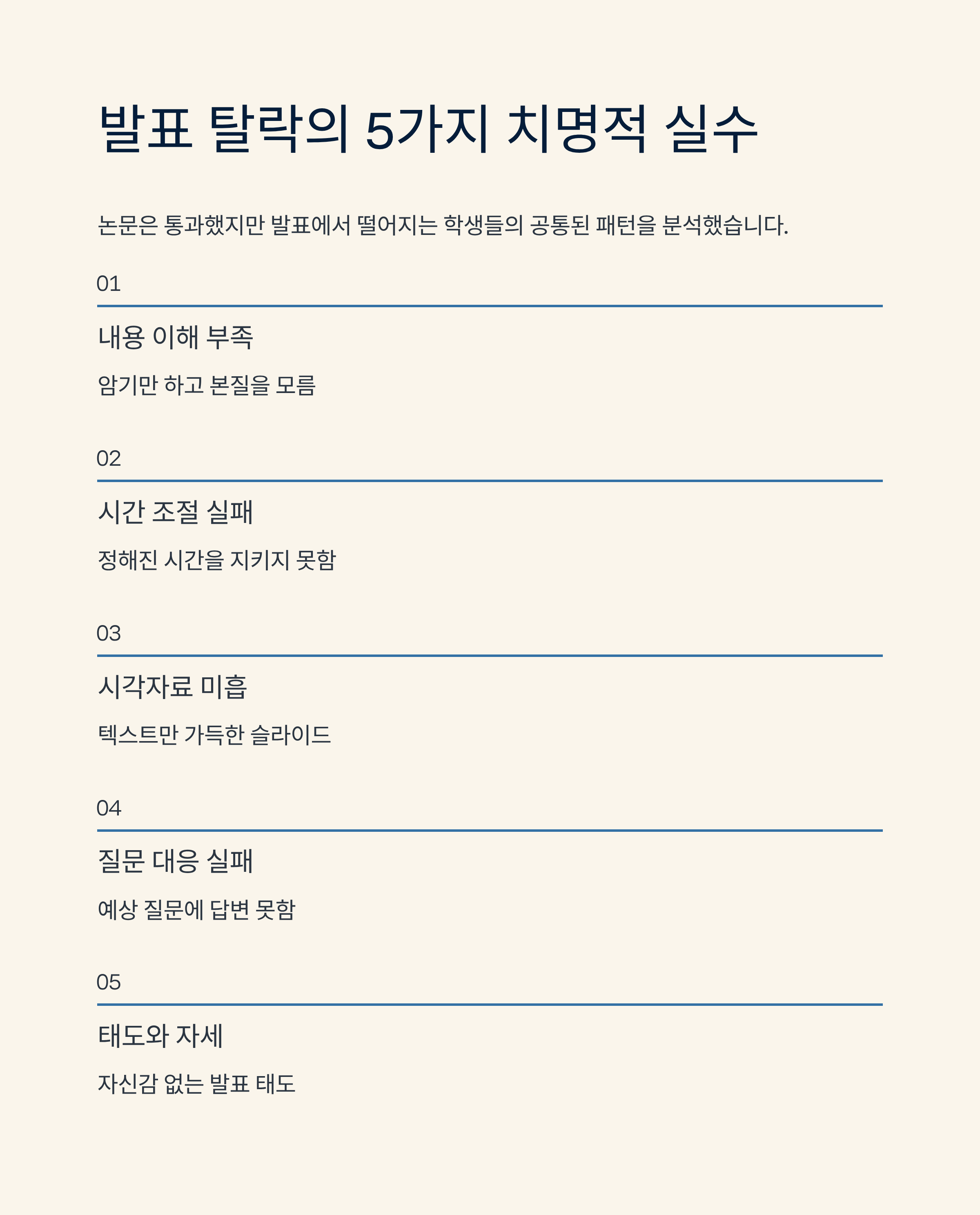 논문은 통과했지만, 발표에서 탈락하는 사례는 생각보다 많습니다. 학위 심사 발표는 단순히 내용만 전달하는 자리가 아니라, 연구에 대한 완전한 이해와 표현 능력을 검증받는 시험대입니다. 발표를 단순한 통과 절차로 여기면 낭패를 보기 쉽습니다.