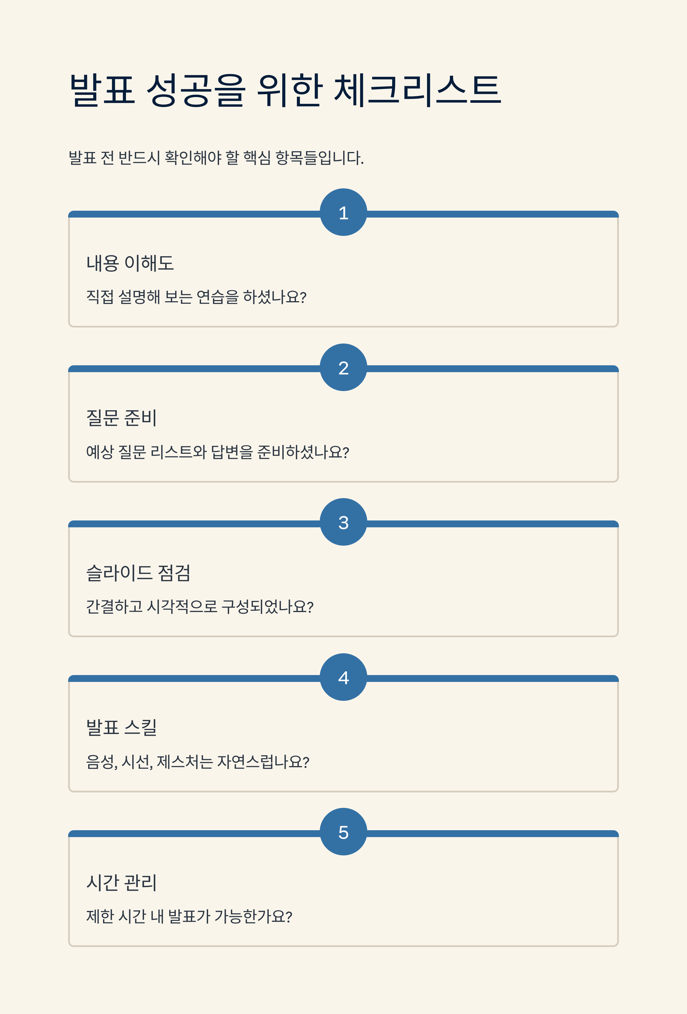 | 💡 알아두세요 발표자 자신감은 연구 신뢰도에 직결됩니다. 내용과 태도 모두 준비하세요. |