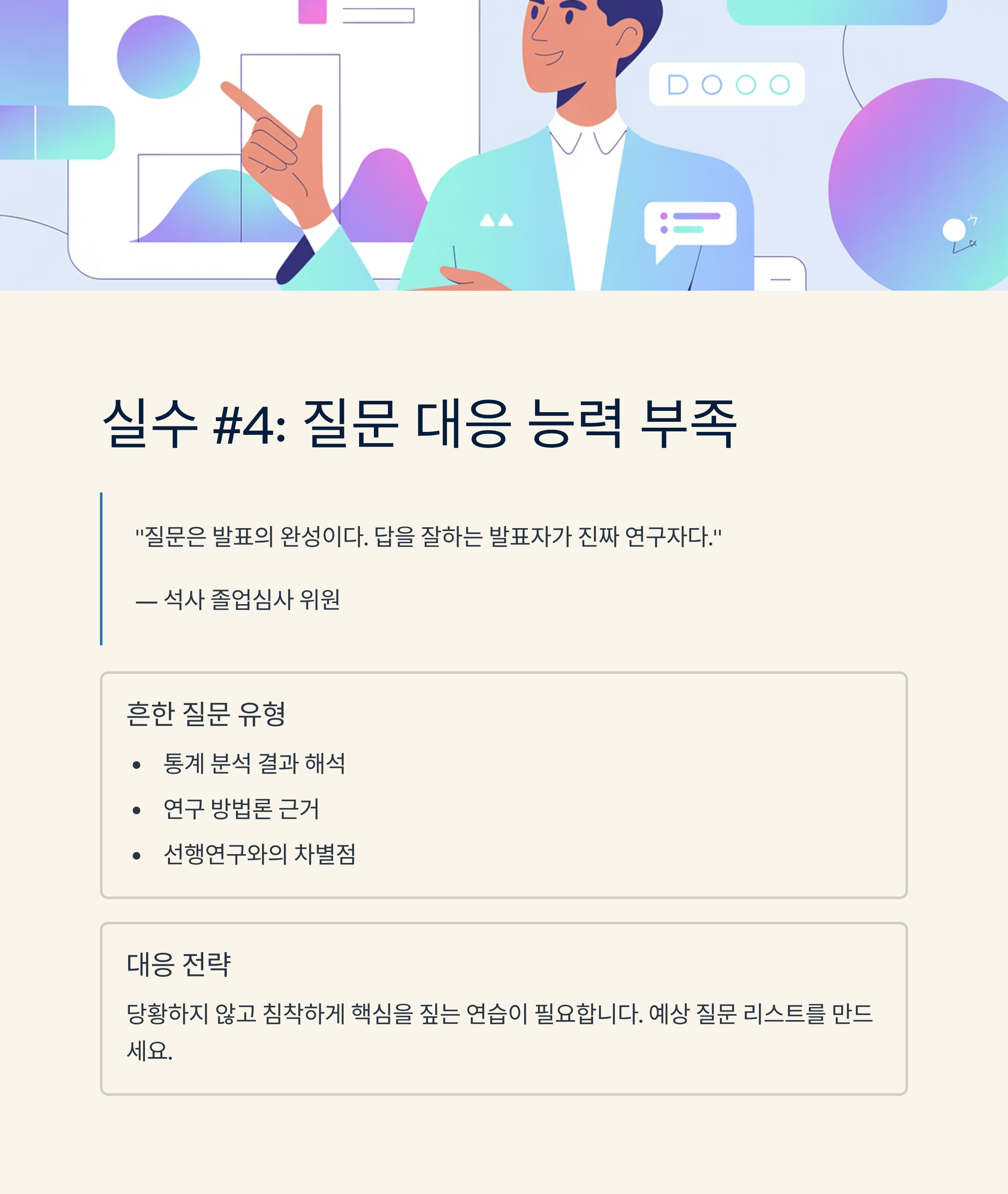 논문을 아무리 잘 써도, 질문에 우왕좌왕하면 '표절했나?', '이해 못 했나?'라는 의심을 받을 수 있습니다. 특히 통계 분석 결과 해석이나 연구 방법론에 대한 질문은 기본 중의 기본입니다. 당황하지 않고 침착하게 핵심을 짚는 훈련이 필요합니다.