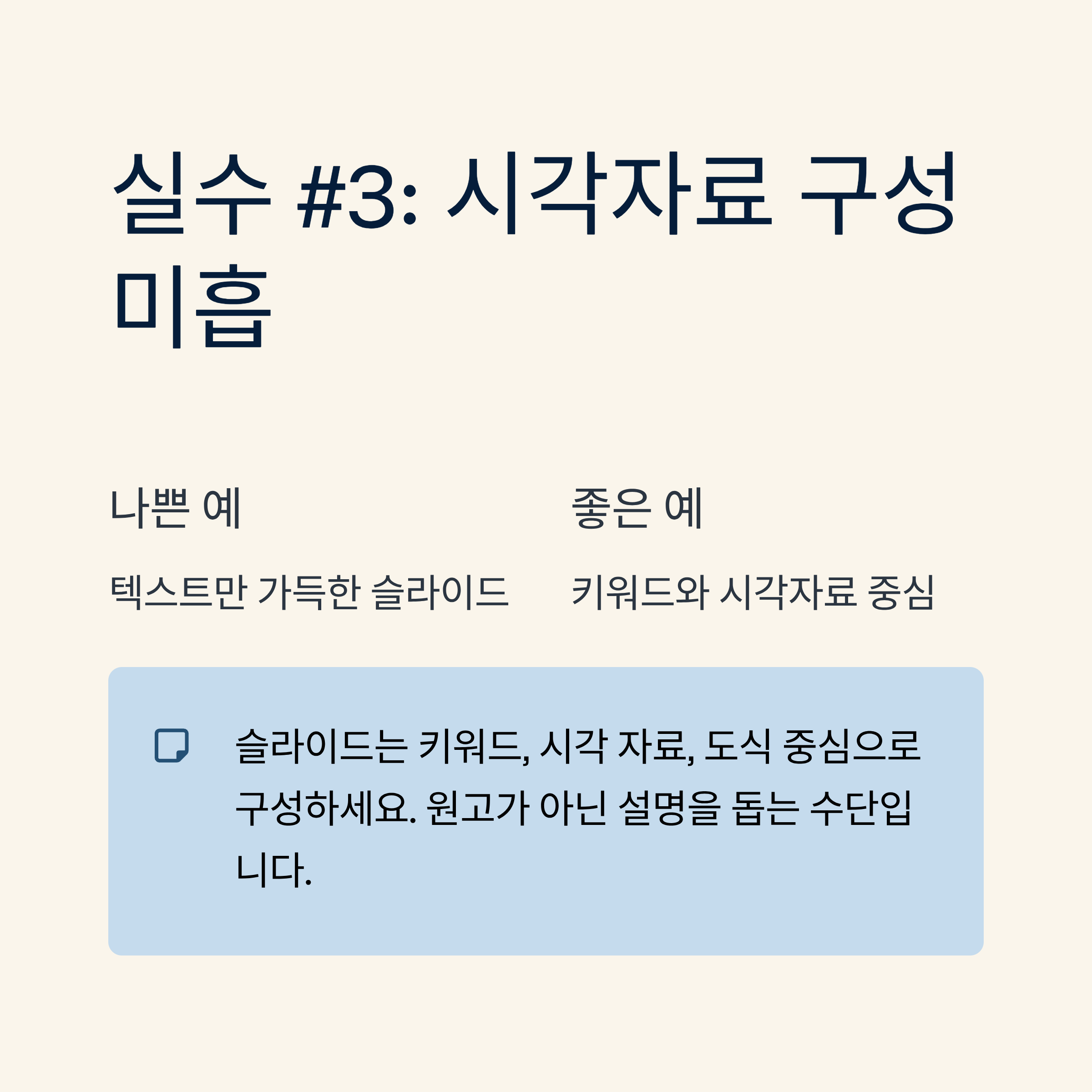 슬라이드 텍스트가 너무 많거나, 이미지 없이 글만 나열된 PPT는 청중의 집중을 떨어뜨립니다. 깔끔한 디자인, 도식, 그래프, 요약 키워드가 포함되어야 하며, 중요한 내용은 한눈에 파악 가능해야 합니다. 시각 자료는 발표자의 설명을 돕는 수단이지, 원고가 아닙니다.