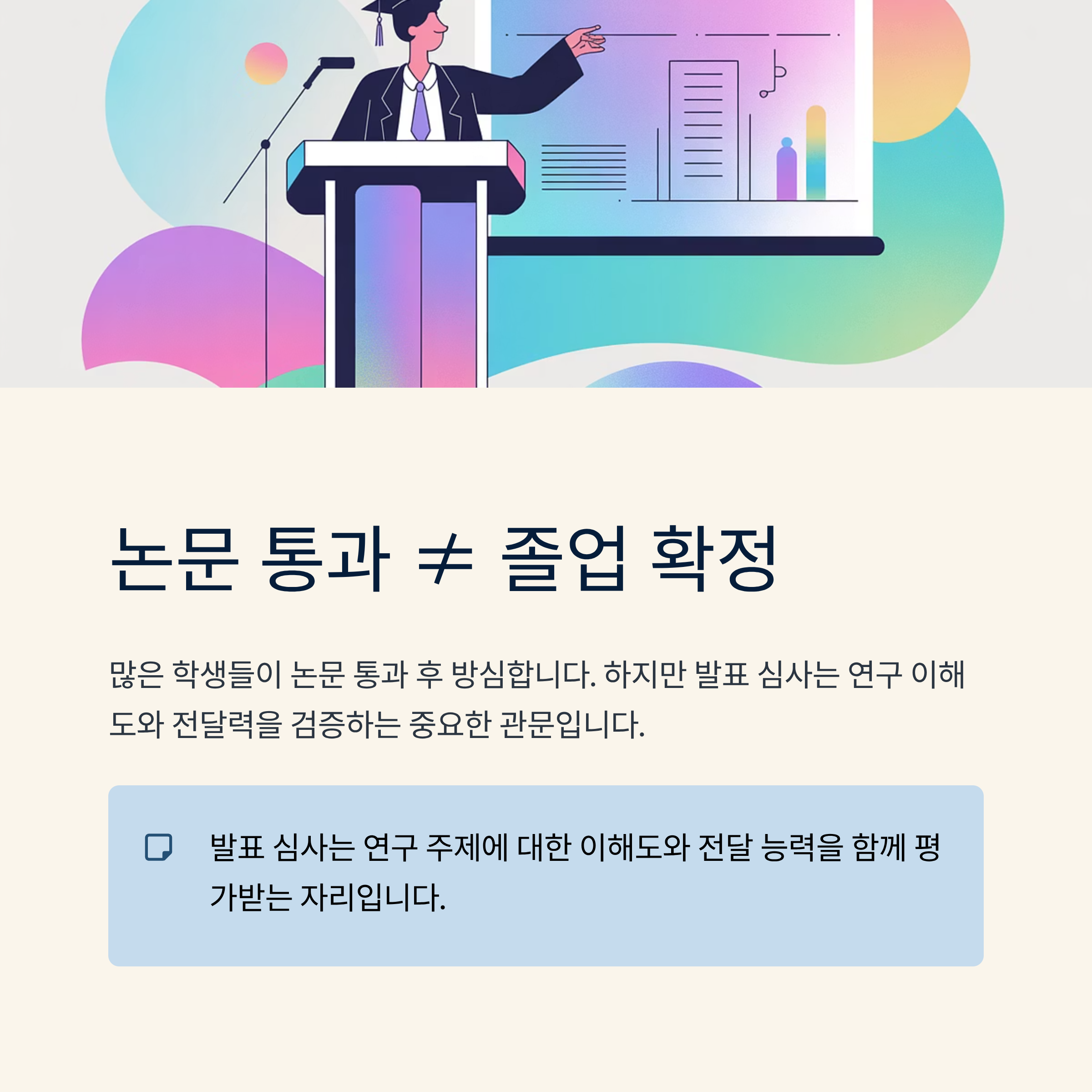 | 💡 알아두세요 논문 심사 발표는 연구 주제에 대한 이해도와 전달 능력을 함께 평가받는 자리입니다. |