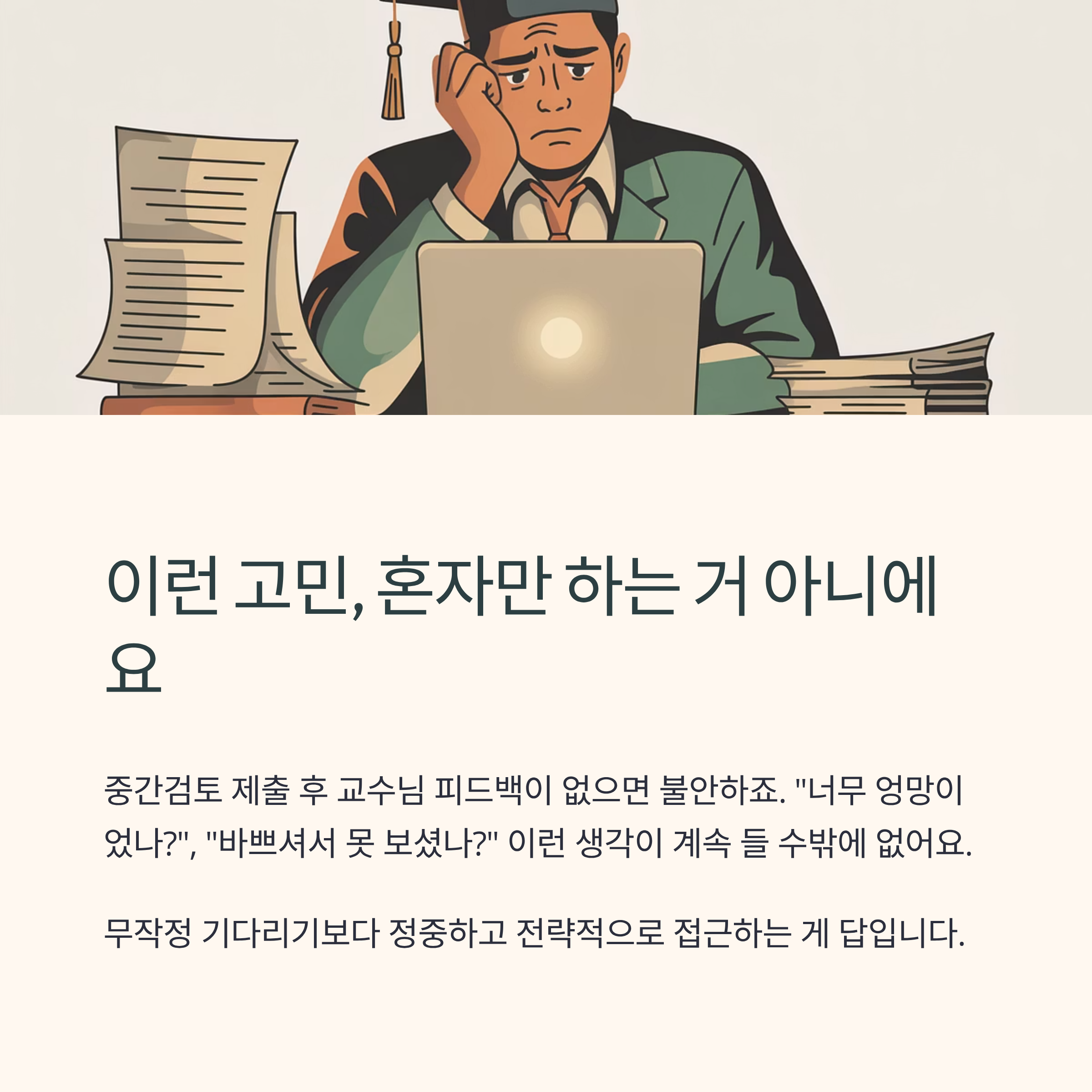논문을 열심히 작성해 중간검토에 제출했는데, 며칠이 지나도 교수님께 아무런 피드백이 없다면 걱정이 앞서게 됩니다. '혹시 너무 엉망이었나?', '바쁘셔서 못 보셨나?', 이런 생각이 들 수밖에 없죠. 이럴 때는 무작정 기다리기보다 정중하고 전략적인 방식으로 교수님의 반응을 유도하는 것이 중요합니다. 아래 글에서는 교수님의 스타일을 고려해 어떻게 자연스럽게 피드백을 이끌어낼 수 있는지 실전 팁을 정리해드립니다.