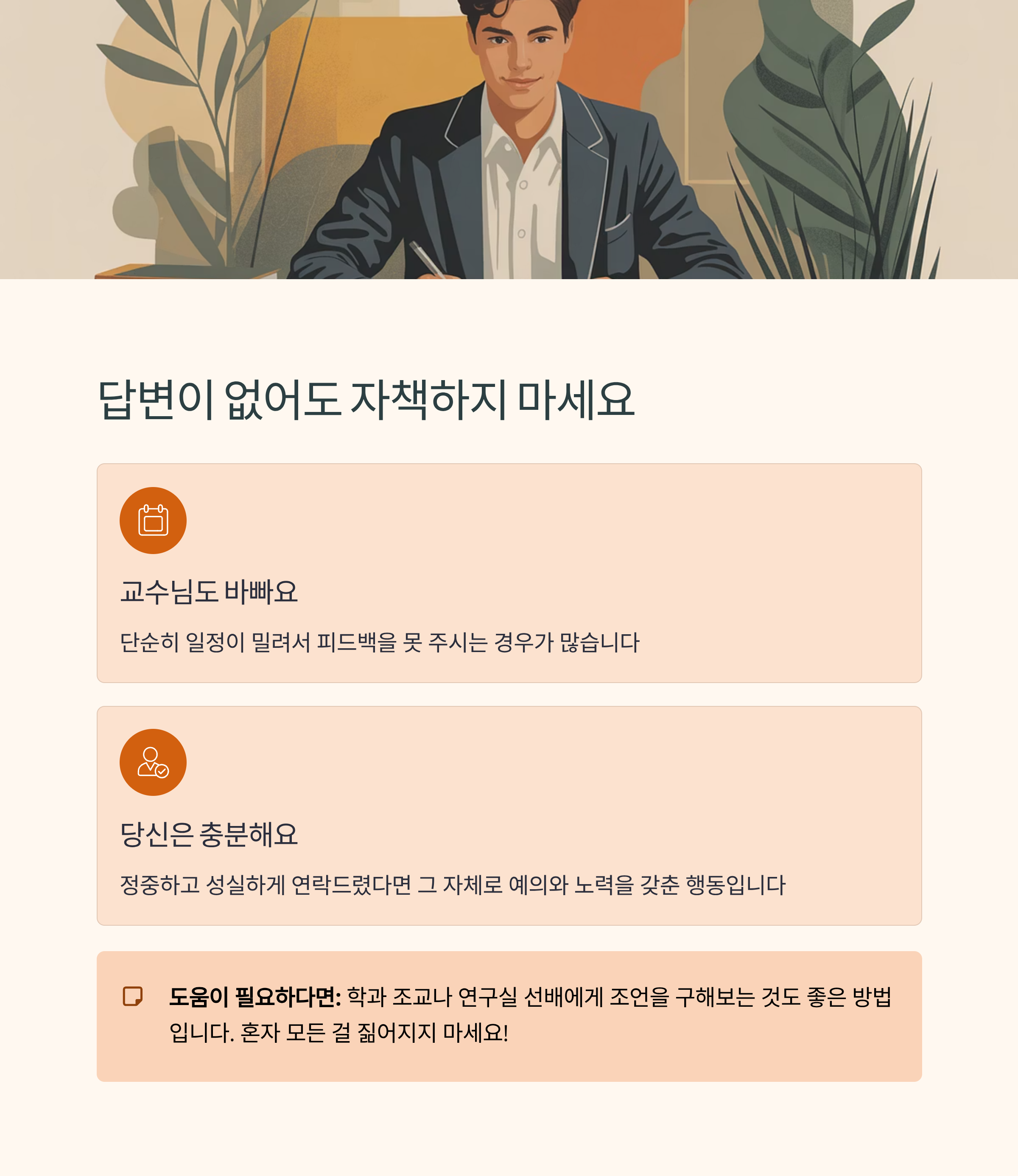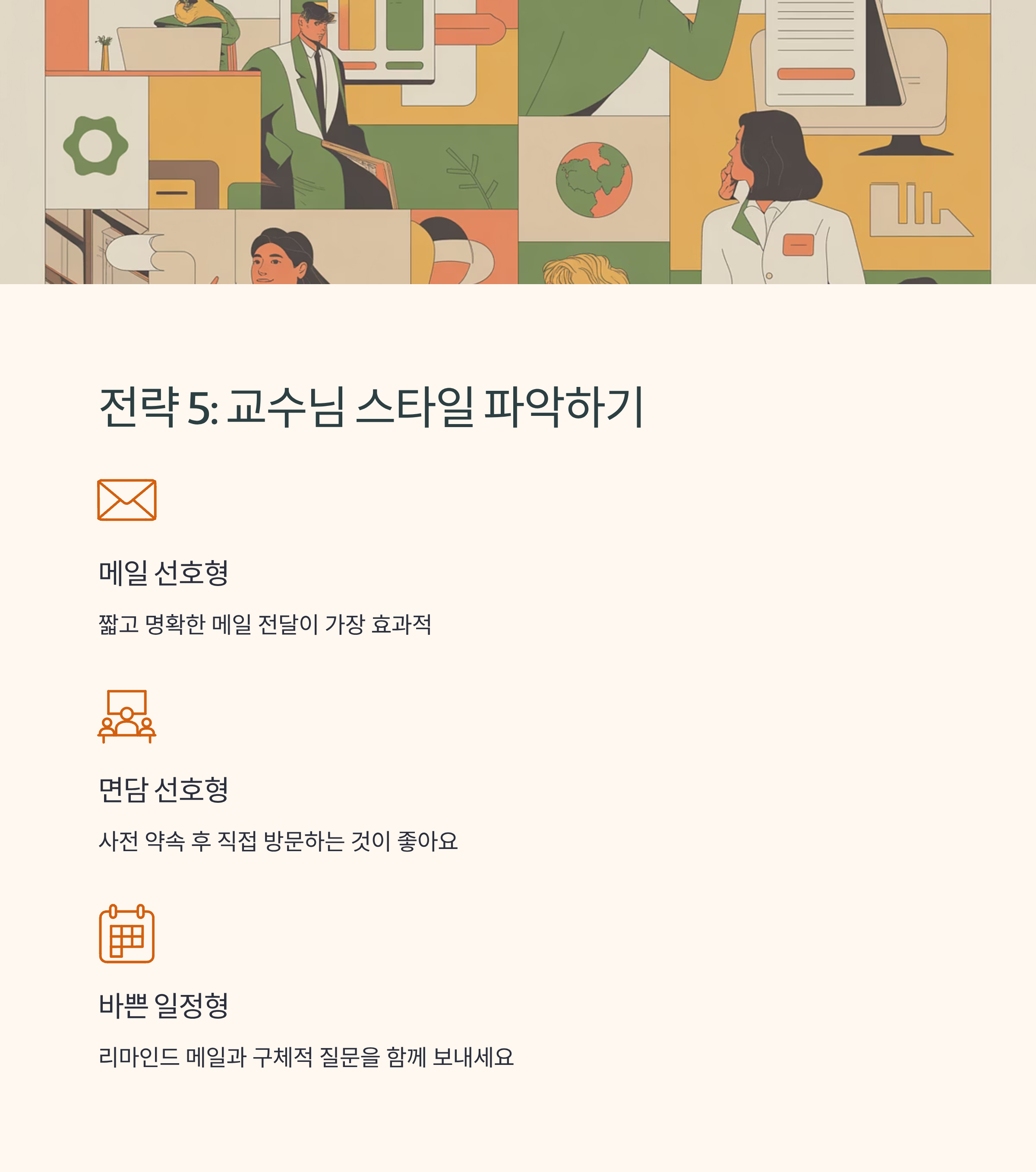 자신의 교수님이 어떤 스타일인지 파악하고, 그에 맞는 방식으로 접근해야 답변 가능성이 높아집니다.