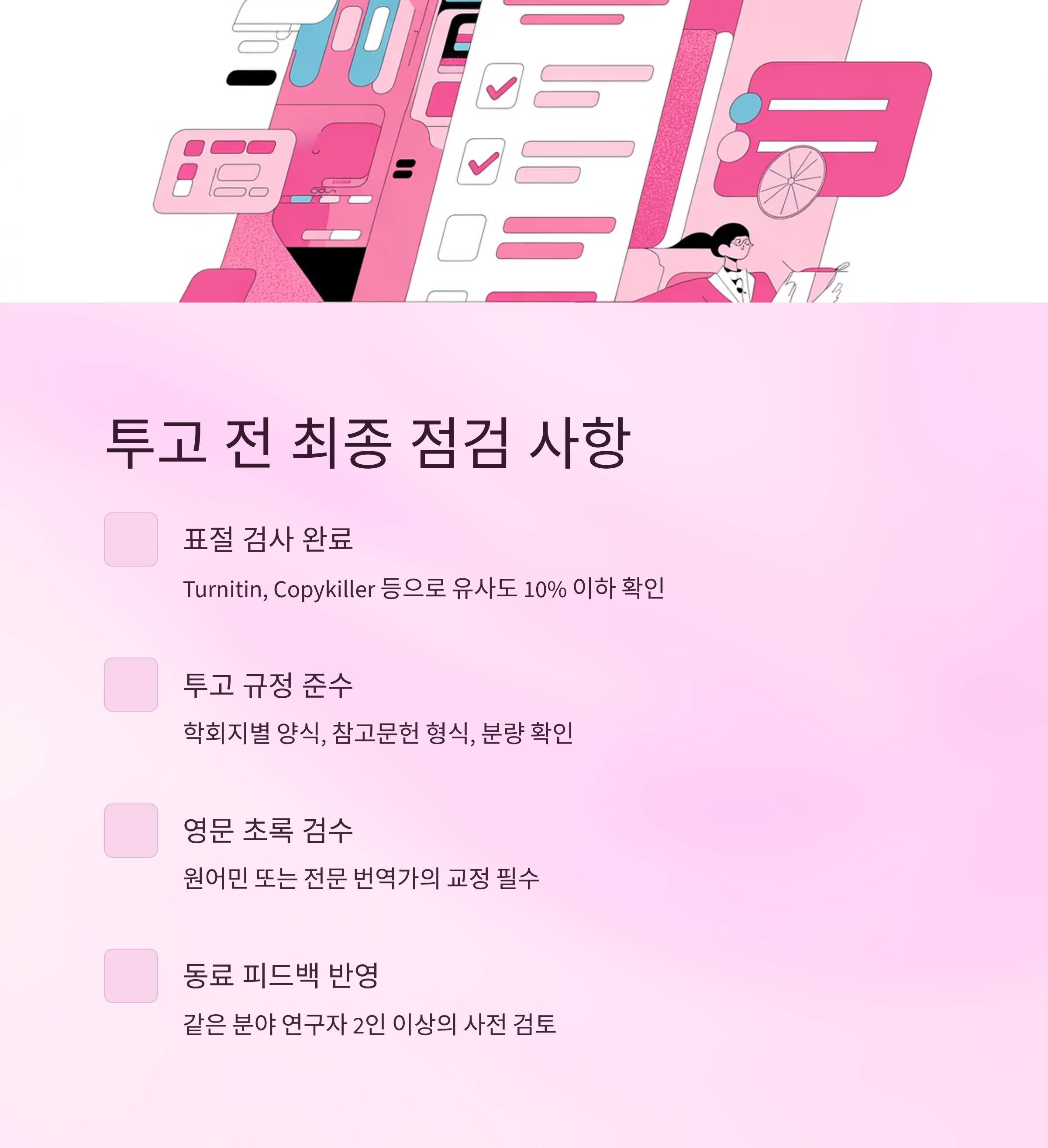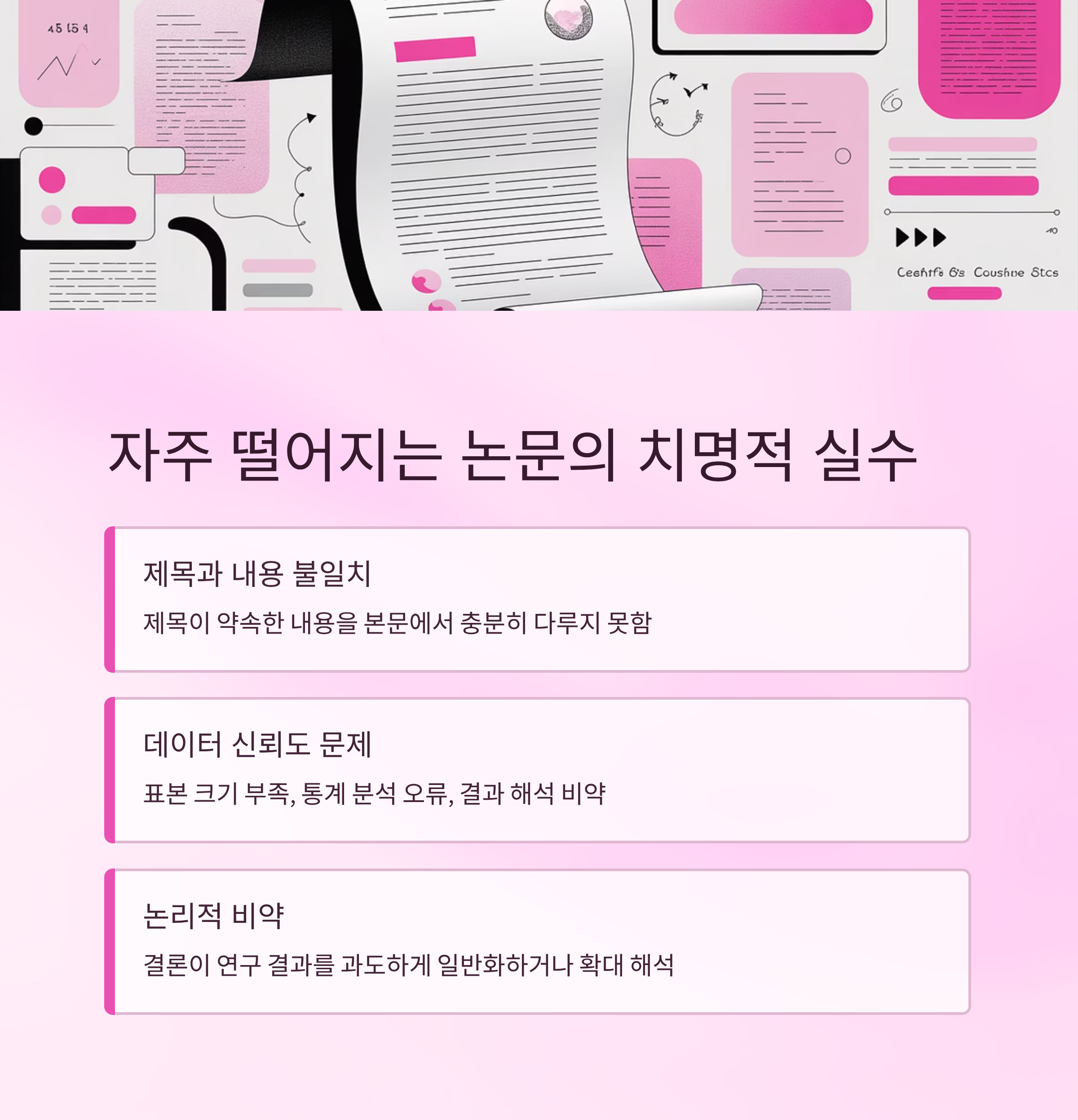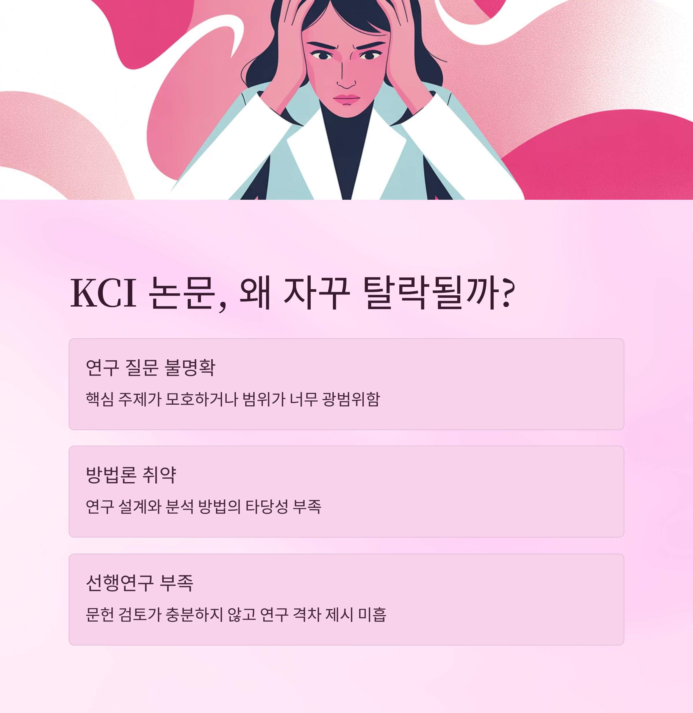 ๋ด๊ฐ ์๊ฐํ์ ๋, KCI ๋ ผ๋ฌธ์์ ๊ฐ์ฅ ์ค์ํ ๊ฑด ๊ฒฐ๊ตญ '์ ๋ฌธ์ฑ + ์ฒด๊ณ์ฑ + ์ค๋๋ ฅ'์ด๋ผ๋ ์ธ ๊ฐ์ง ์ถ์ด์์. ์ด ์ค ํ๋๋ง ๋น ์ ธ๋ ์ฌ์ฌ์๋ ๊ณ ๊ฐ๋ฅผ ๊ฐธ์ฐ๋ฑํ๊ฒ ๋๋ต๋๋ค. ๊ทธ๋์ ๋ค์ ์น์ ์์ ํํ ์ ์ง๋ฅด๋ ์ค์๋ค์ ์ง์ด๋ณผ๊ฒ์.
