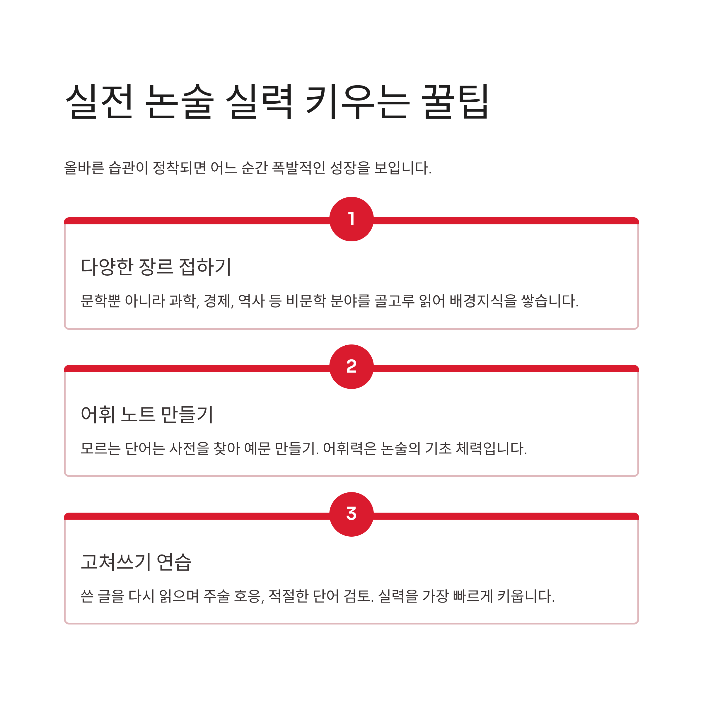 논술 실력은 하루아침에 좋아지지 않습니다. 하지만 올바른 습관이 정착되면 어느 순간 폭발적인 성장을 보이게 됩니다.