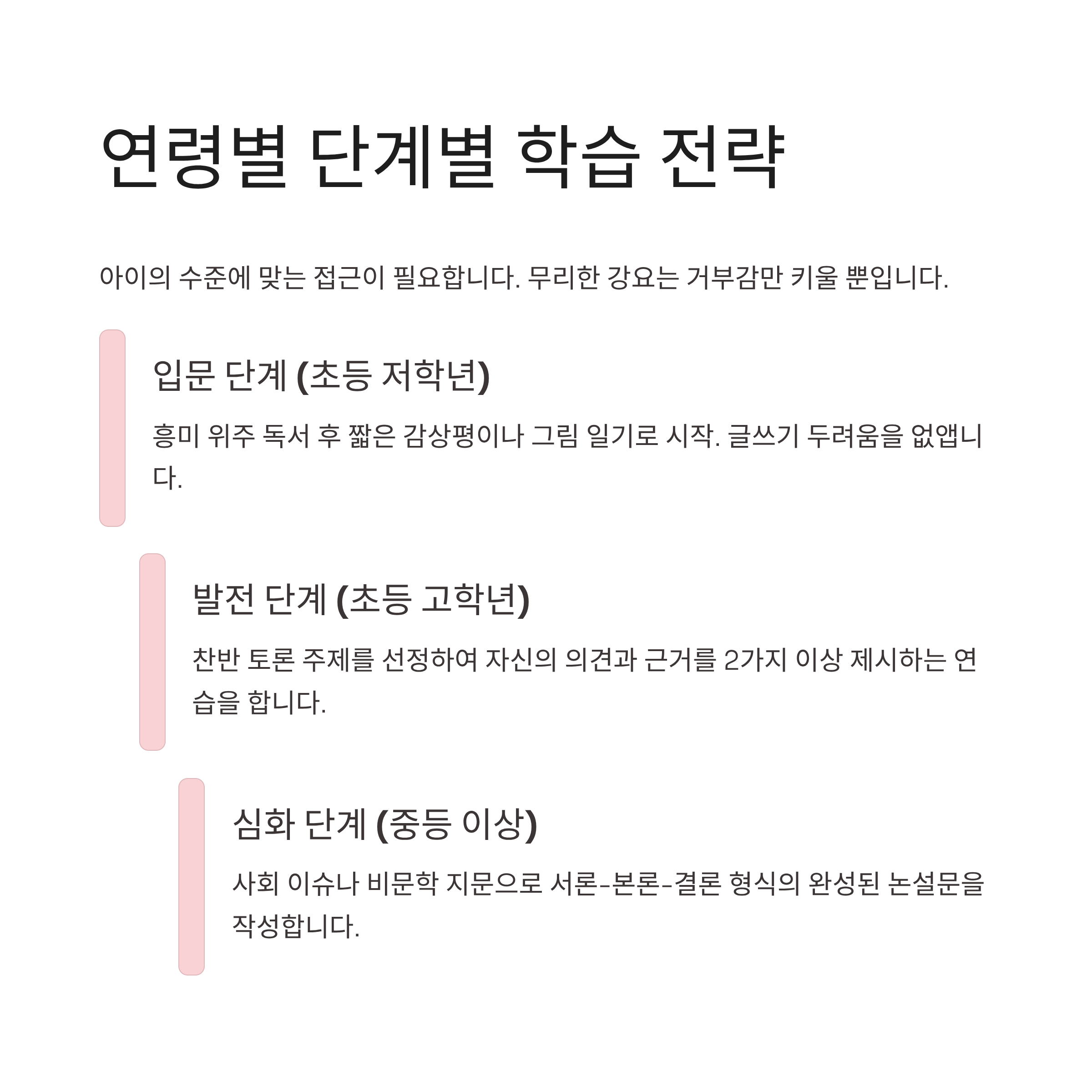 아이의 연령과 수준에 맞는 단계별 접근이 필요합니다. 무작정 긴 글을 쓰라고 강요하는 것은 독서에 대한 거부감만 키울 뿐입니다.