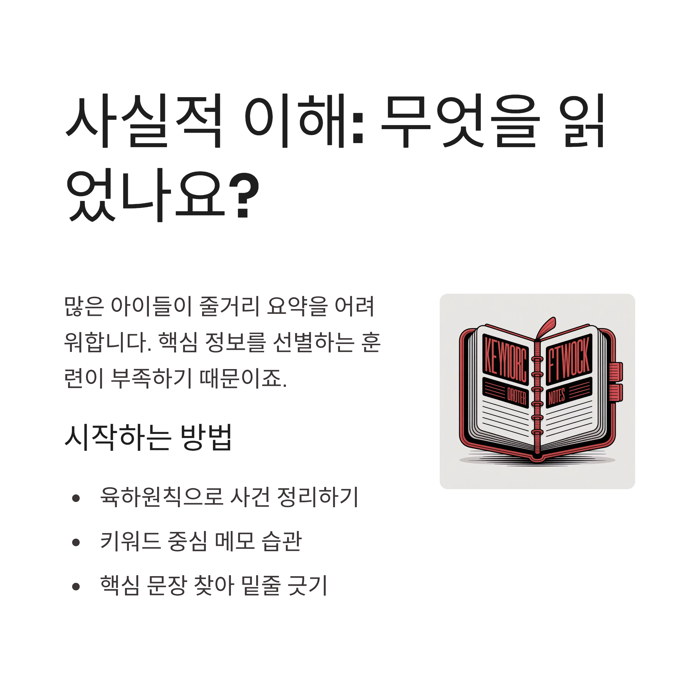 많은 아이들이 줄거리를 요약하라고 하면 어려워합니다. 이는 텍스트의 핵심 정보를 선별하는 훈련이 부족하기 때문입니다. 처음에는 육하원칙에 따라 사건을 정리하는 습관을 들이는 것이 중요하며, 키워드 중심의 메모를 활용하면 큰 도움이 됩니다.