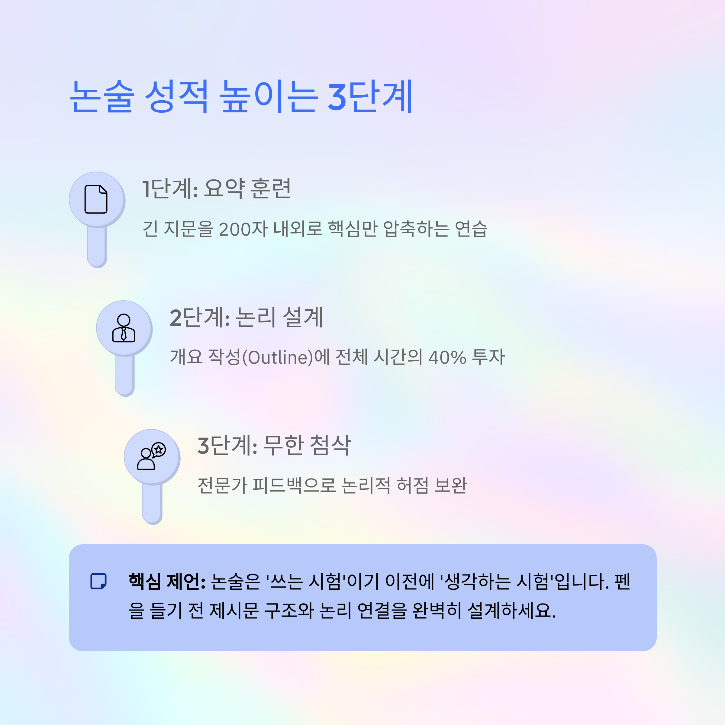 논술은 '쓰는 시험'이기 이전에 '생각하는 시험'입니다. 펜을 들기 전까지 제시문의 구조와 논리적 연결 고리를 완벽히 설계하는 연습에 집중하세요.