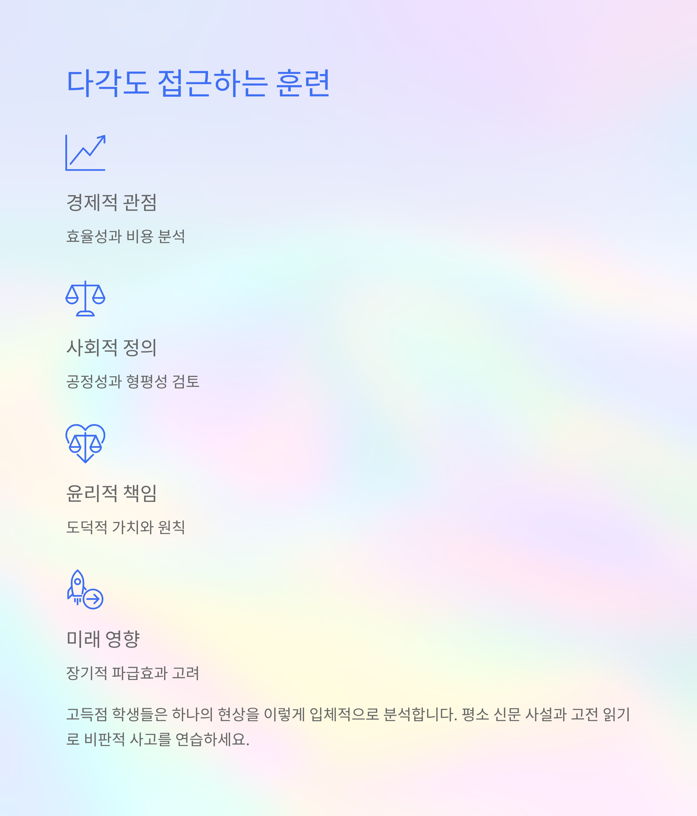 고득점을 받는 학생들의 공통점은 하나의 현상을 다각도로 분석한다는 점입니다. 예를 들어 '경제적 효율성'이라는 주제가 나왔을 때, 단순히 찬성/반대를 넘어 사회적 정의, 윤리적 책임, 미래 세대 영향력 등 다양한 관점에서 논리를 전개합니다. 이러한 입체적 사고는 단기간에 완성되지 않으므로, 평소 신문 사설이나 고전 읽기를 통해 비판적으로 생각하는 연습이 필요합니다.