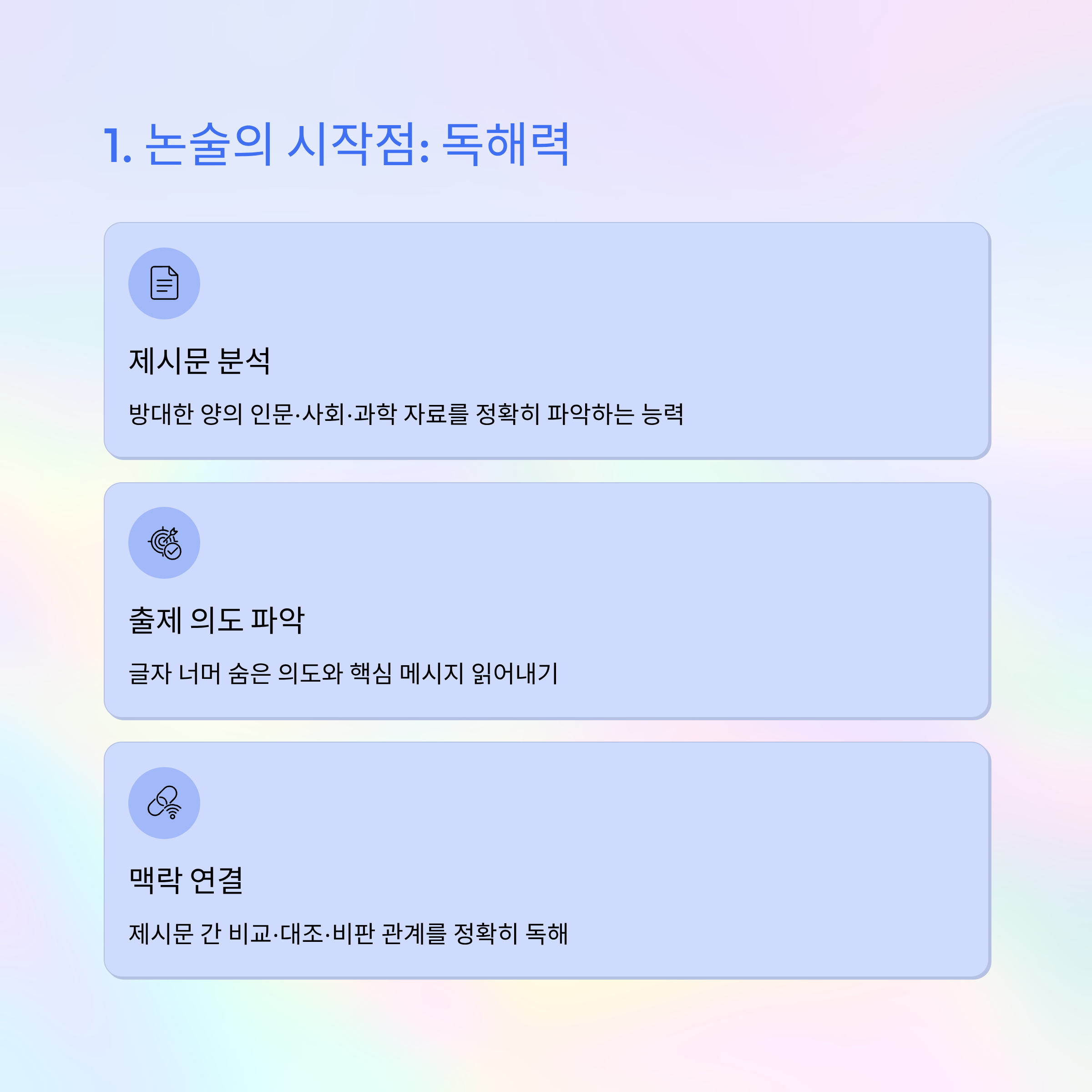 독해력은 논술의 기본입니다. 제시문을 읽을 때 '왜 이 문장이 여기에 배치되었는가'를 끊임없이 질문하며 읽는 습관을 들여야 합니다.