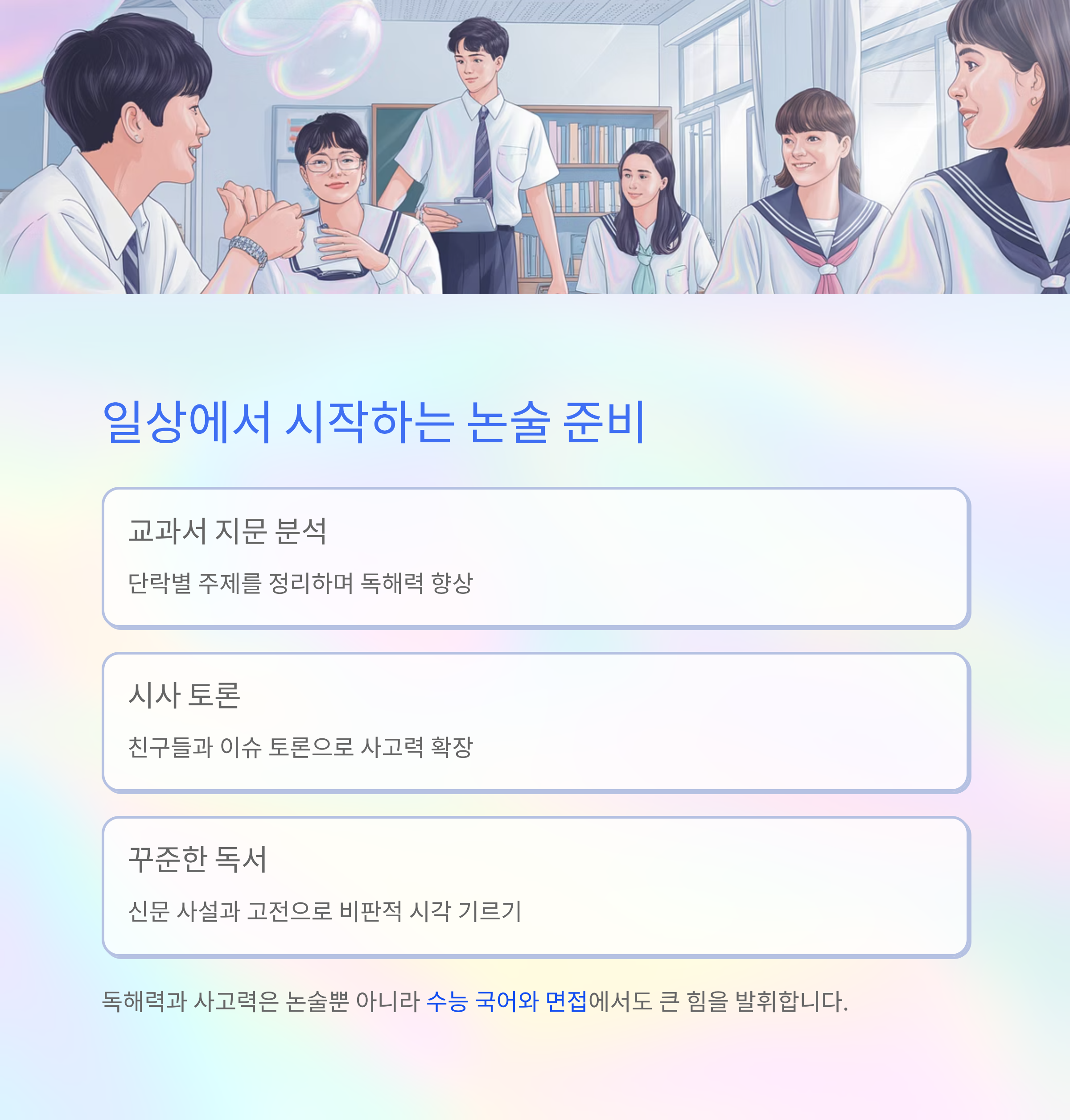 고등학교 논술 준비는 결코 멀리 있지 않습니다. 교과서의 지문을 읽을 때도 단락별 주제를 정리해보고, 친구들과 시사 이슈에 대해 토론해보는 모든 과정이 논술 공부의 시작입니다. 독해력과 사고력은 비단 논술 전형뿐만 아니라 수능 국어나 면접에서도 큰 힘을 발휘하는 필살기가 될 것입니다. 끈기 있게 읽고 깊게 생각하는 훈련을 통해 여러분의 꿈을 향한 합격의 문을 활짝 여시길 응원합니다! 👍