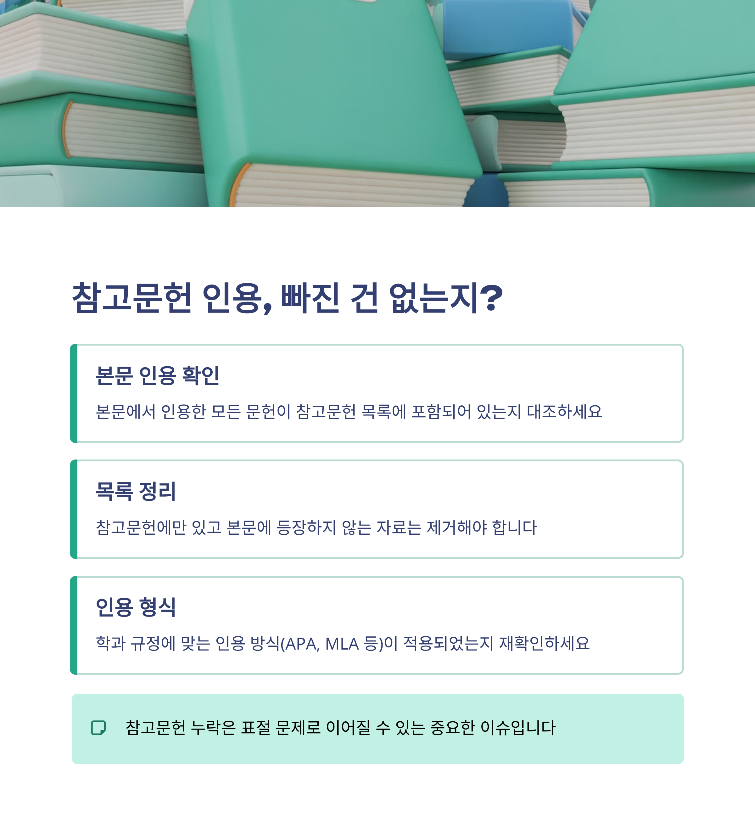 본문에 인용한 문헌이 참고문헌 목록에 빠짐없이 들어 있는지, 또 반대로 목록에만 있고 본문에 등장하지 않는 자료는 없는지도 체크하세요.