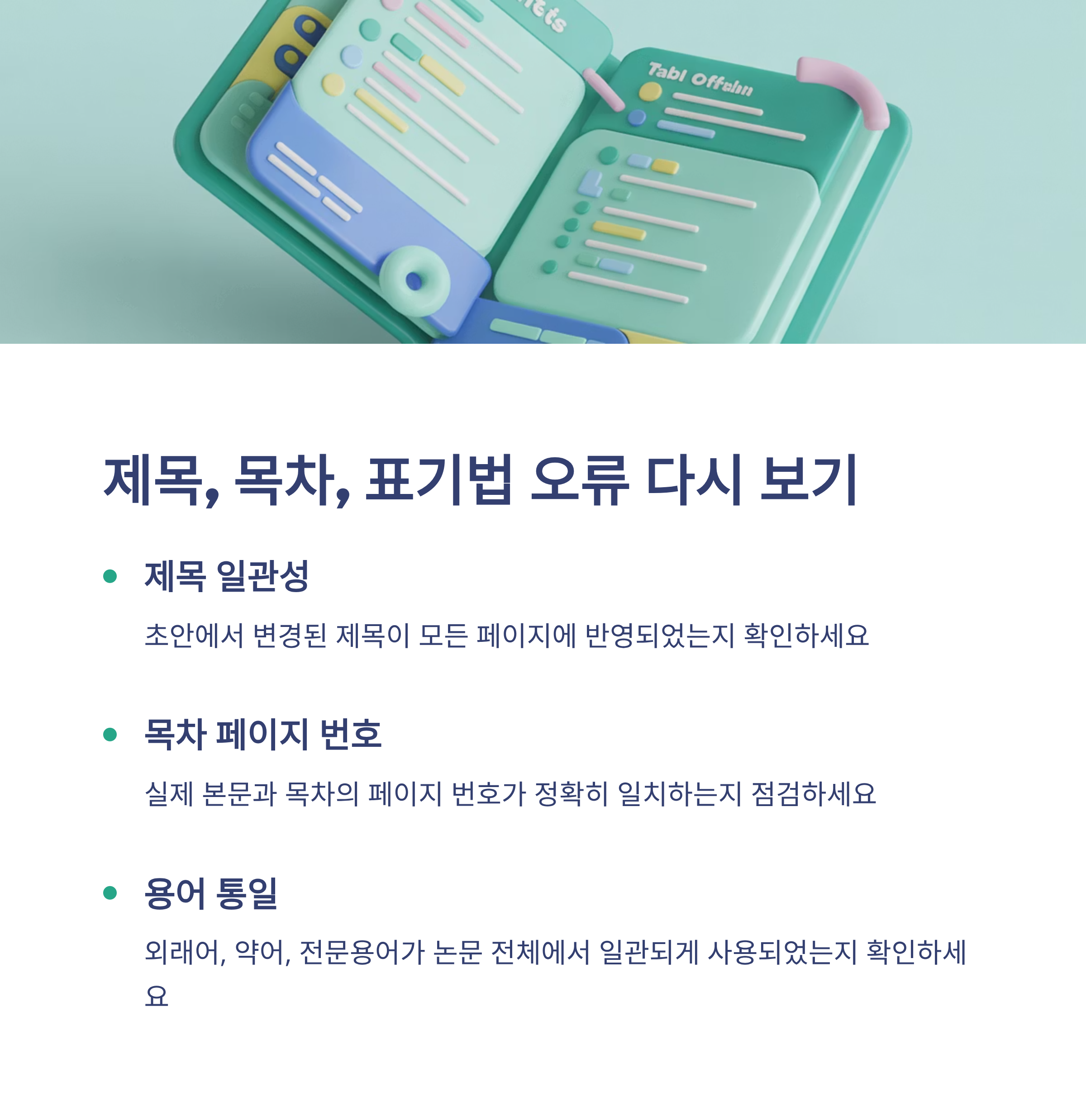 또한 논문 전체에 걸쳐 사용된 용어, 외래어 표기, 약어가 일관되게 사용되었는지 살펴보세요.