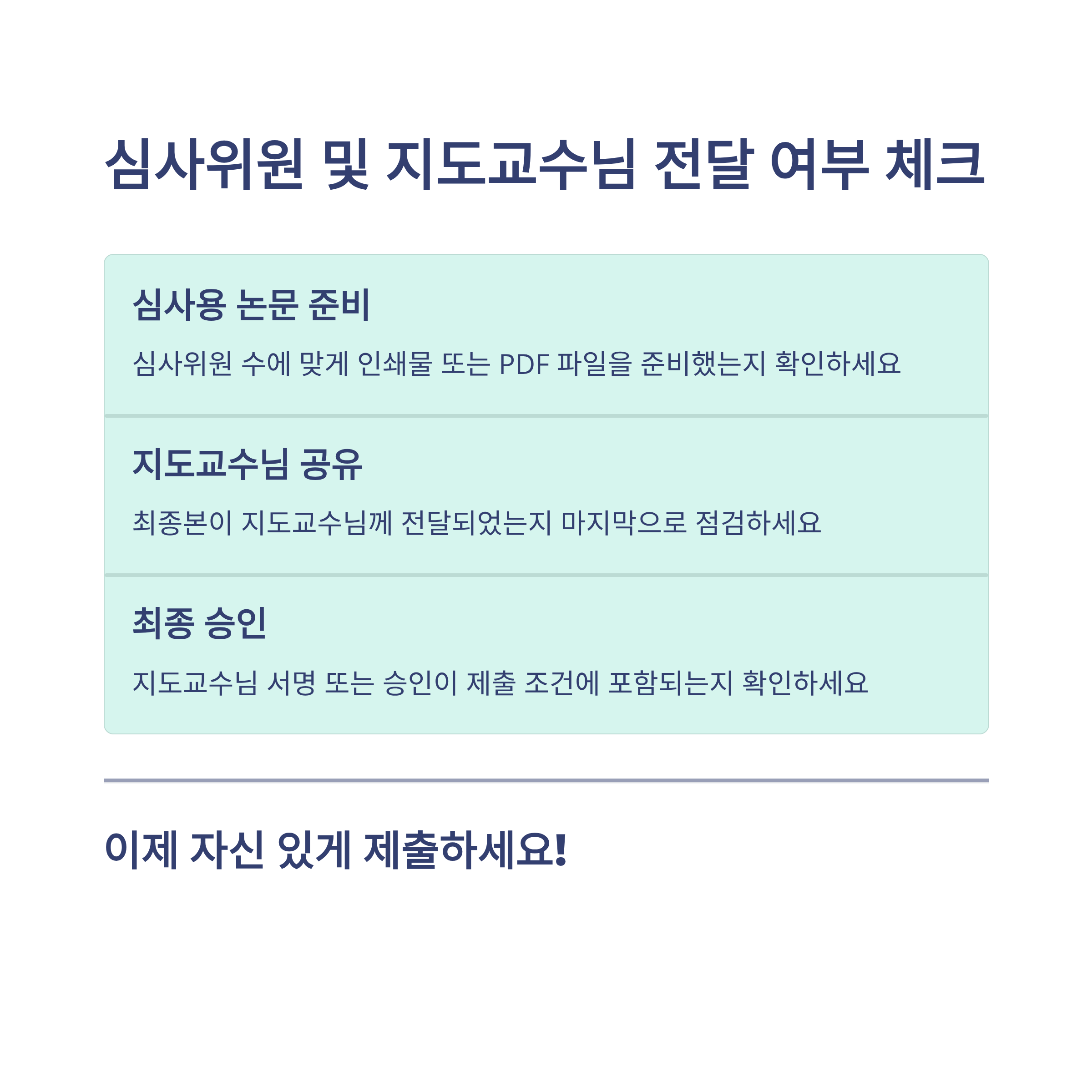 심사용 논문은 따로 준비해야 하는 경우도 많습니다. 심사위원 수에 맞게 인쇄물 또는 PDF 파일을 전달했는지, 지도교수님께 최종본이 공유되었는지도 마지막으로 점검해보세요.
