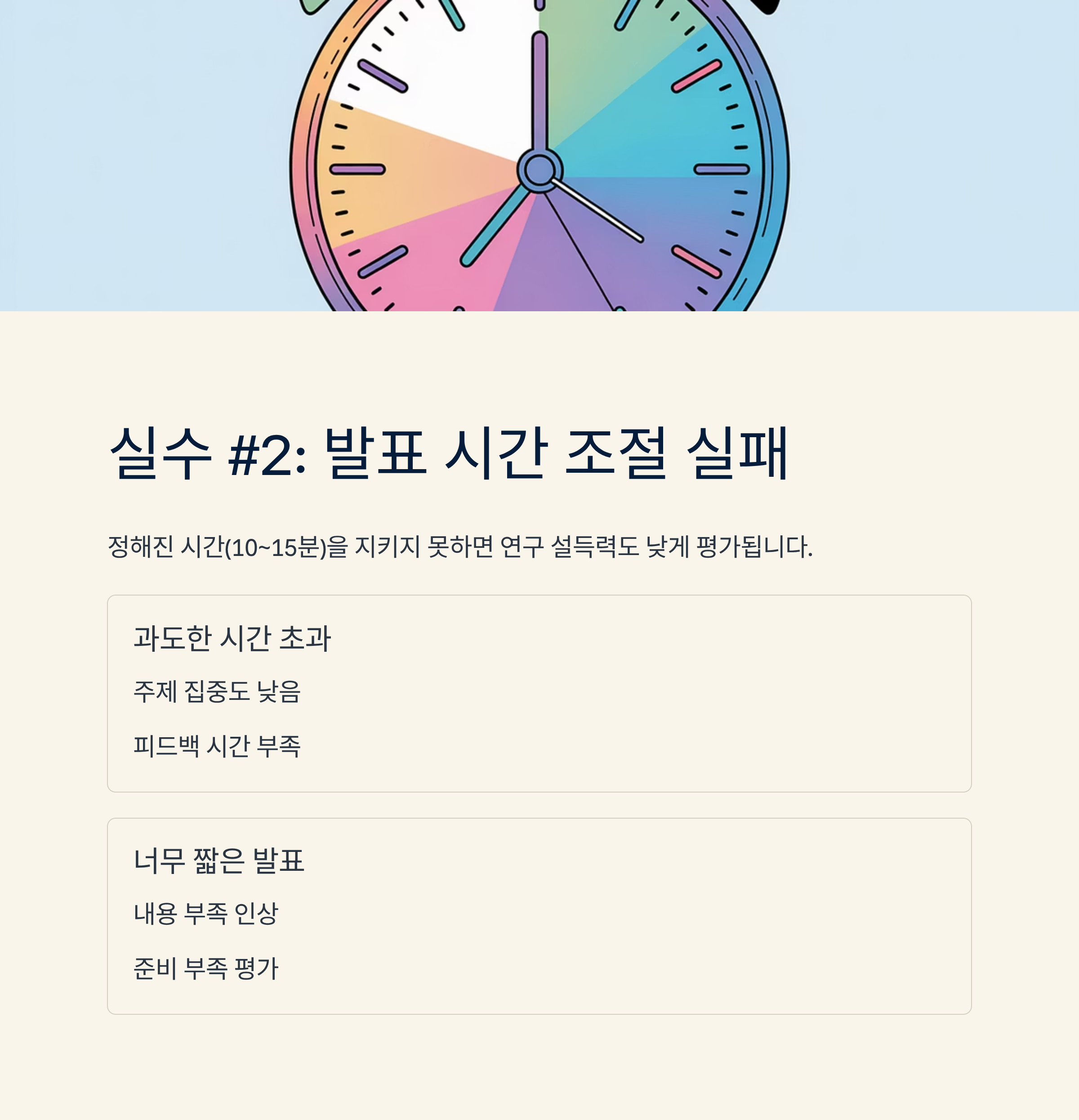 정해진 시간(보통 10~15분)을 초과하거나, 절반도 채 사용하지 못하는 경우 심사위원의 인상을 크게 떨어뜨립니다. 연습 부족이나 PPT 분량 조절 실패가 원인이며, 시간 내에 핵심을 전달하지 못하면 연구 설득력도 낮게 평가됩니다. 최악의 경우, 마무리도 못 하고 종료되기도 합니다.