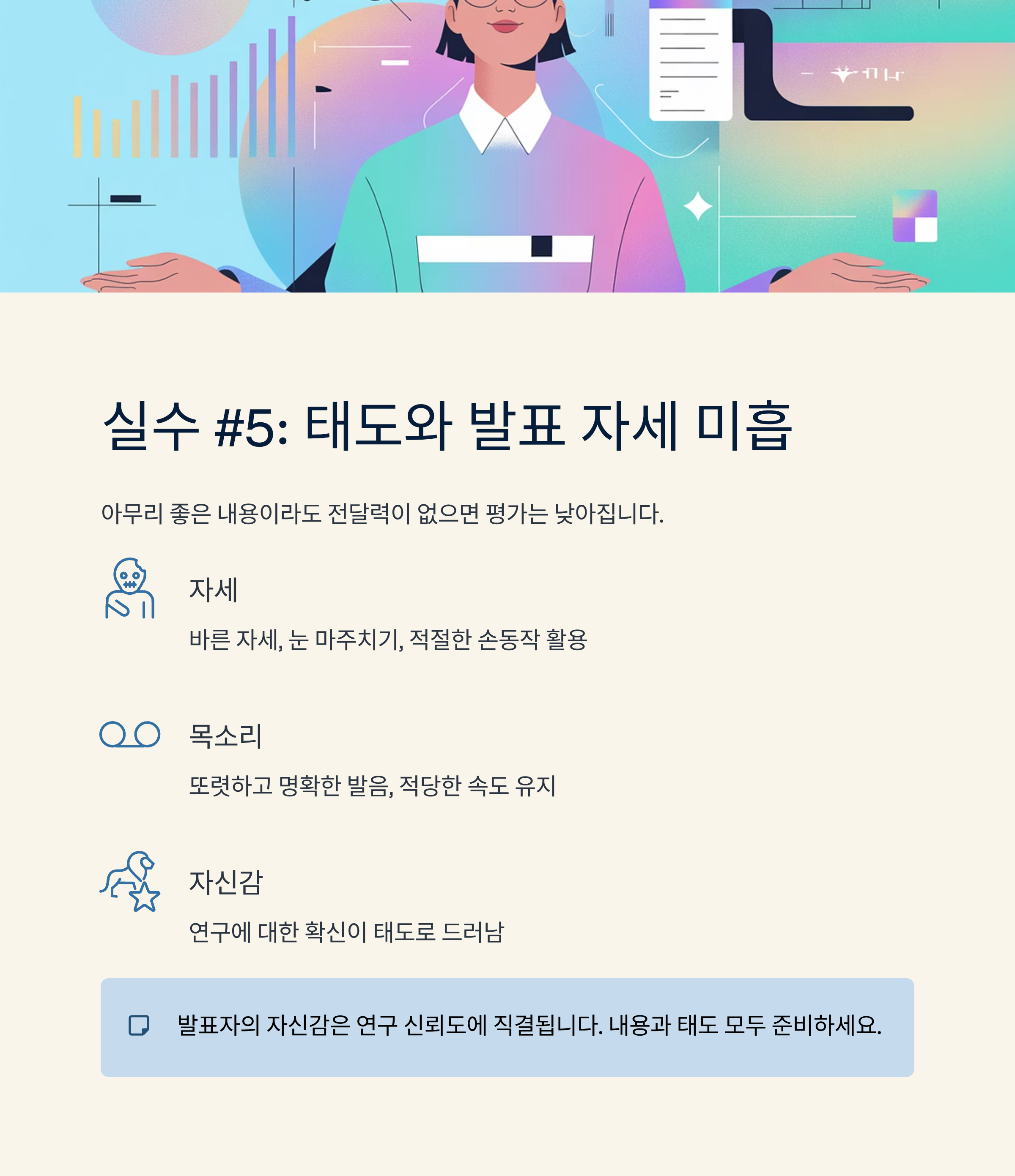 나치게 긴장한 몸짓 등은 아무리 좋은 발표 내용이라도 전달력을 떨어뜨립니다. 심사위원들은 발표자의 태도와 발표 스킬</strong을 통해 연구의 신뢰도를 간접 평가합니다. 자세는 단순한 예의가 아니라 평가 요소입니다.