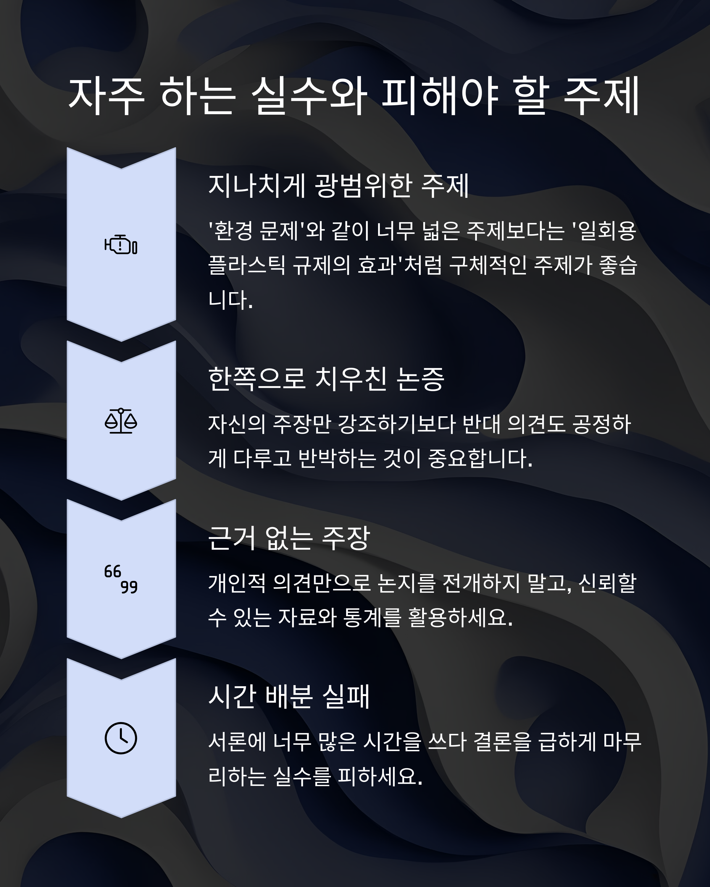 | 주제 선정 실수 | 너무 흔하거나 진부한 주제 |