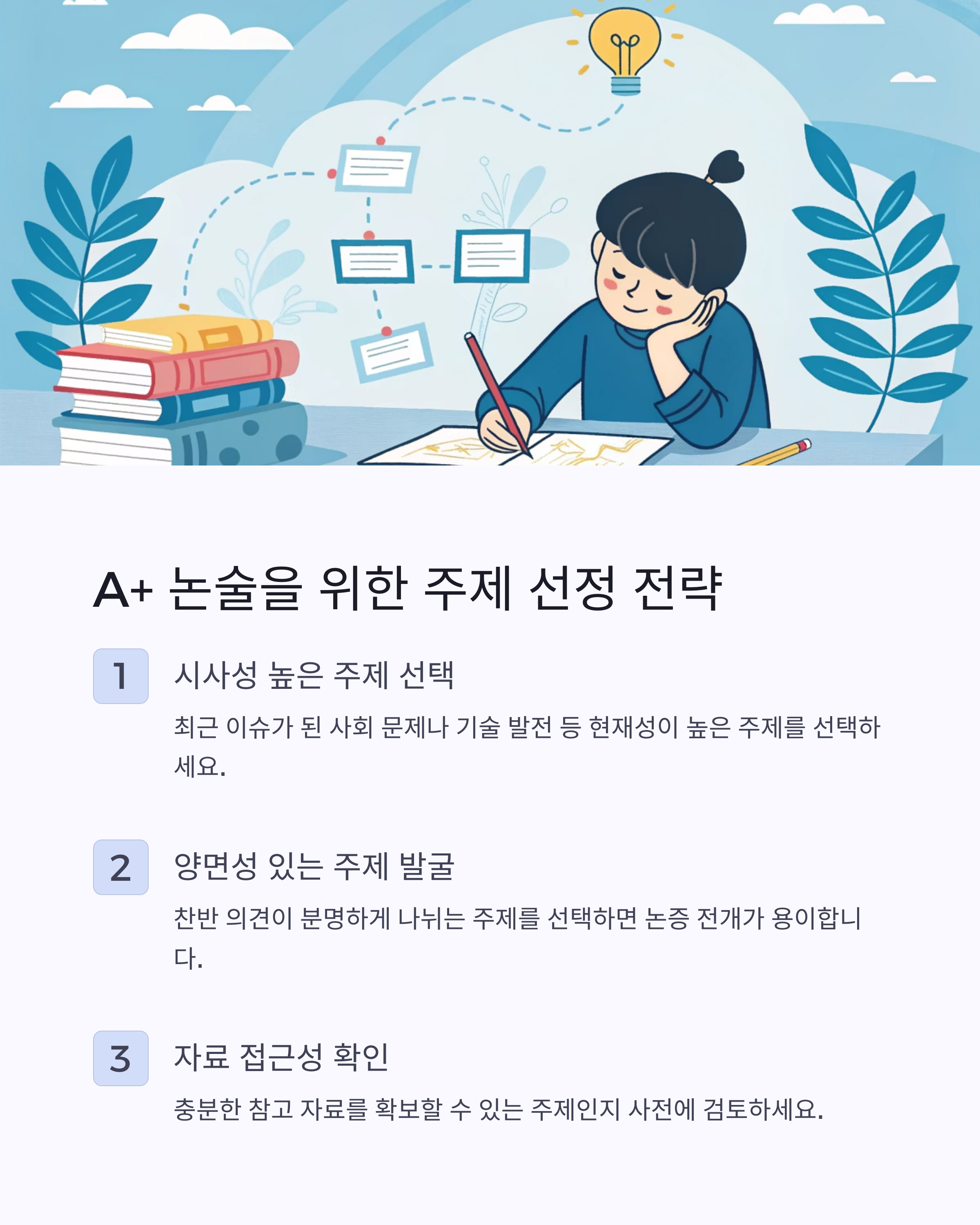 논술 주제를 선정하는 것도 점수를 좌우하는 중요한 요소예요. 어떤 주제를 선택하느냐에 따라 논리 전개가 수월해질 수도, 아니면 너무 어려워서 손도 못 대는 경우도 생겨요. 제가 생각했을 때, 이 시점에서 주제를 어떻게 잡느냐가 논술의 반 이상을 결정한다고 봐요.