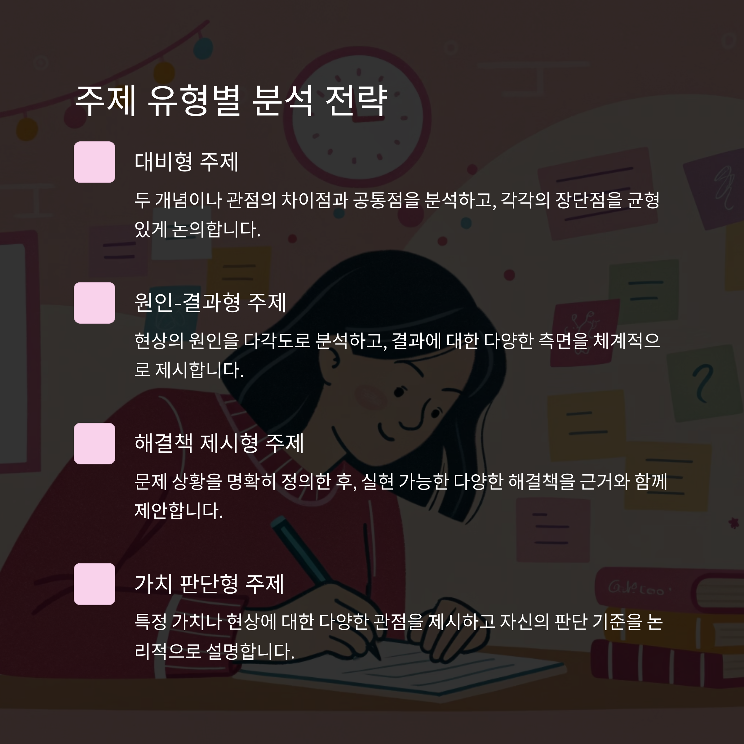 유형마다 요구하는 답변 방식이 다르기 때문에, 주제를 보고 그 유형을 빠르게 파악하는 게 핵심이에요. 예시를 통해 유형별 접근법을 정리해볼게요!