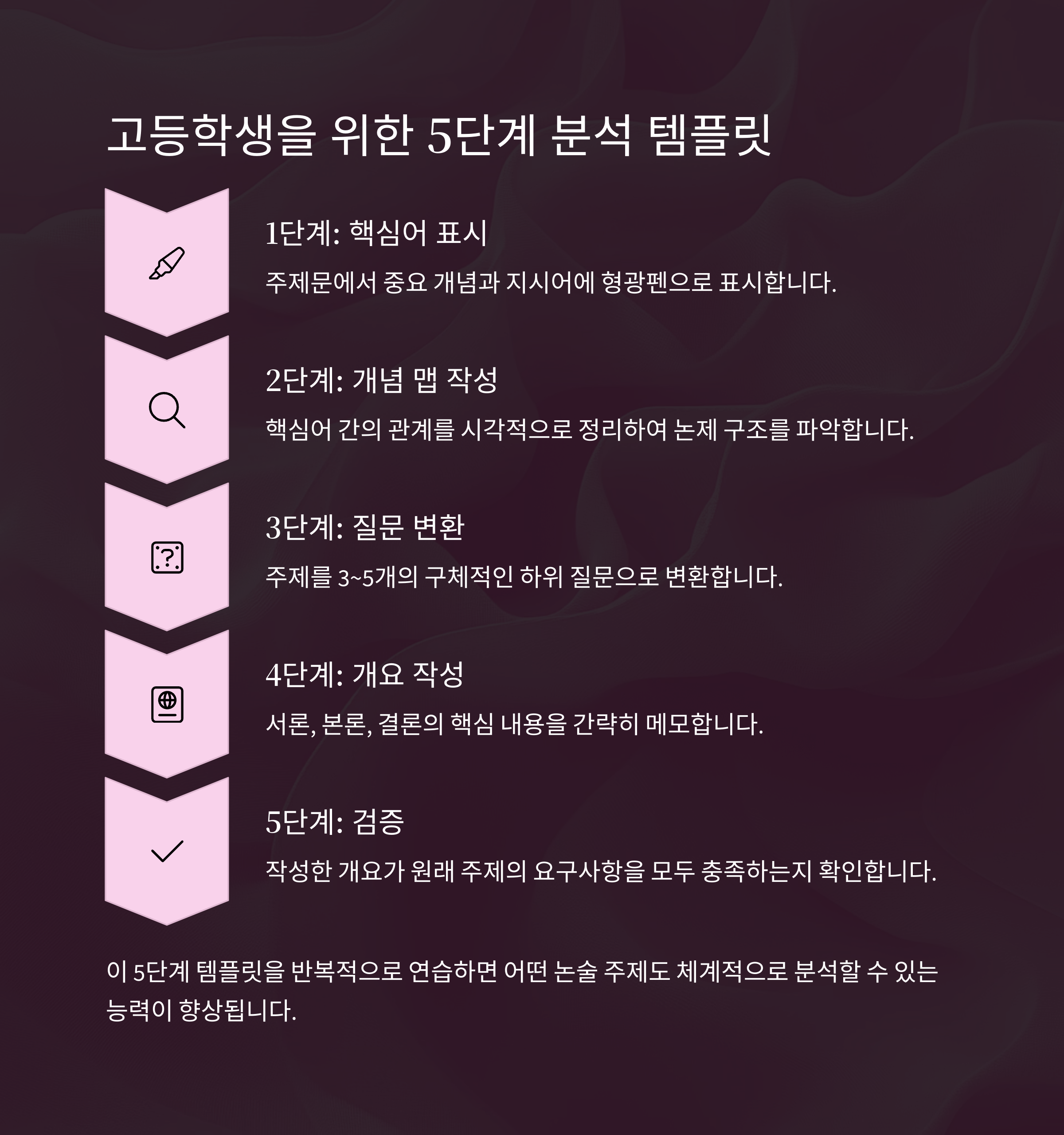 이 5단계 템플릿은 복잡한 논술 주제도 순서대로 분석하게 도와줘요. 특히 모의논술이나 첨삭 수업 때 큰 도움이 된답니다!